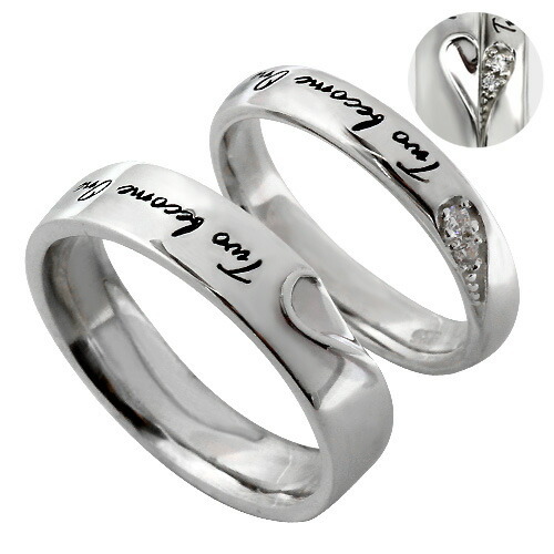 リングの表面に「two become one(二人は一つになる)」というメッセージが彫刻されたペアリングです。最大の特徴は、メッセージ左側部分にデザインされた彫刻が、ペアで重ねる事でハートの形状になる点です。それぞれのハートには、メンズ側はシンプルな彫りのデザインに仕上げられ、レディース側は、ハートの中に2つのキュービックジルコニアが埋め込まれ輝きを放ちます。また、リングの内側が内甲丸になっているので優しい着け心地に仕上がっています。