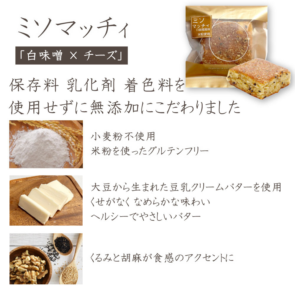 ●ミソマッチィ 全卵、豆乳クリームバター、米粉、きび砂糖、白味噌、アーモンドパウダー、くるみ、黒ごま、白ごま、粉チーズ |