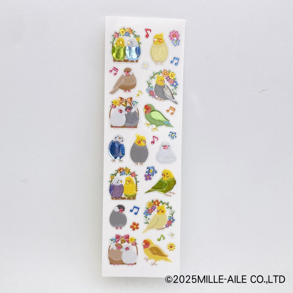 セキセイインコ・オカメインコ・文鳥・コザクラインコなど、人気の小鳥たちが色とりどりのお花と一緒に描かれており、手帳デコ・お手紙・ラッピングのワンポイントとして使うと、明るく華やかな雰囲気を添えてくれます。
