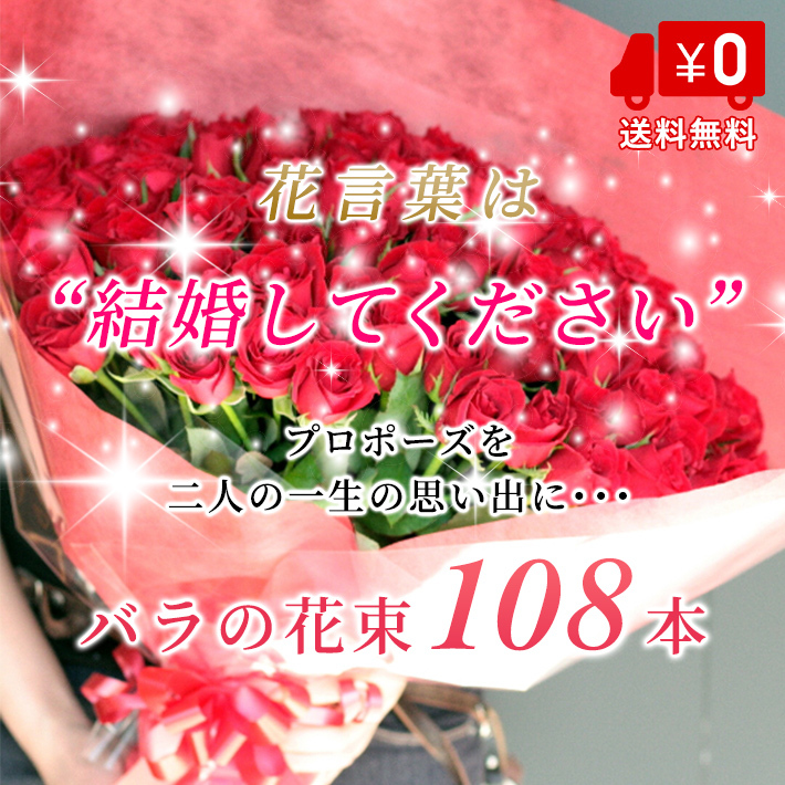 ○一生に一度のプロポーズにお手頃な価格で108本の花束をご用意いたしました ○お色は「赤」「ピンク」「お任せミックス」がお選びいただけます長さは40cmです小ぶりな花束ですが108本の束ですと豪華な花束になります! ○ラッピング料別途300円(プロポーズ特別仕様の高級和紙)、送料無料にてお届けいたします ○カスミソウ1本・・・+300円で追加できます。※別途「カスミソウ」からお買い求め下さい。 ○送料は無料です。 (ただし、九州は別途660円、沖縄本島は別途1,980円、沖縄本島以外及び離島は別途2,200円かかります) | |