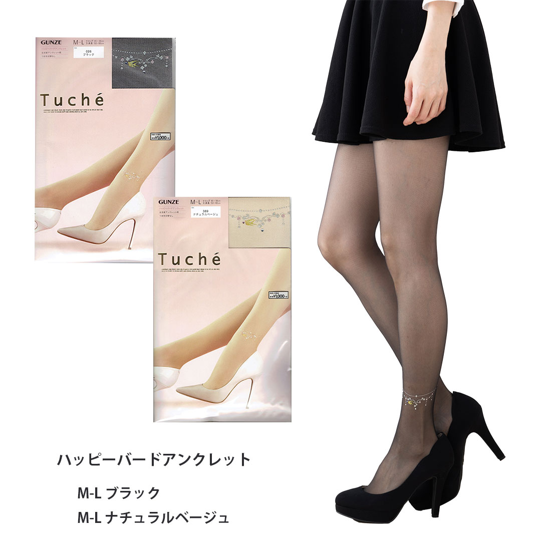 Tuche ハッピーバードアンクレット ストッキング M-L 日本製 黒 ベージュ レディース シアータイツ グンゼ トゥシェ D1PK