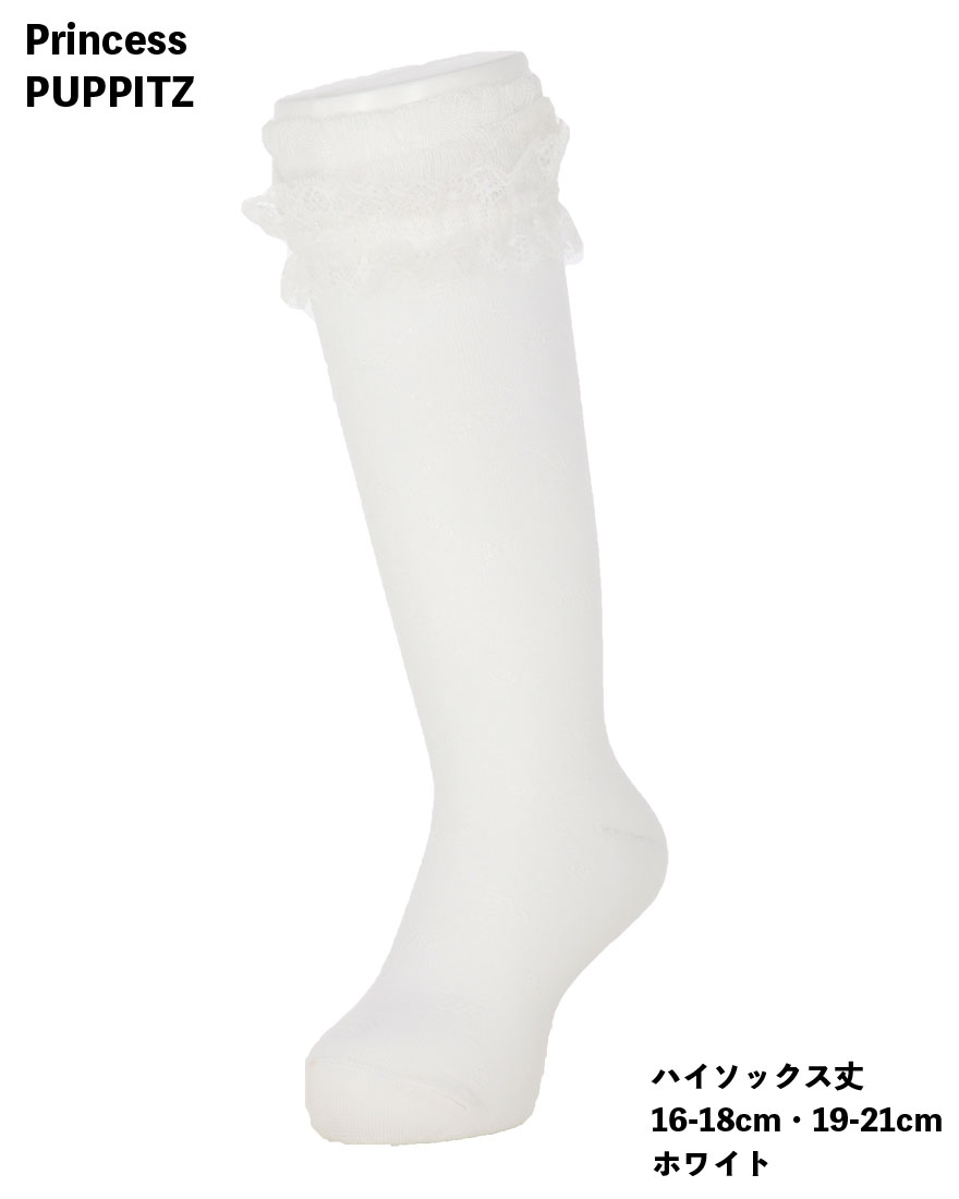 (キッズ16-18cm・19-21cm)プリンセスパピッツ リボンフロート柄 ハイソックス レース付き 白 子供用 靴下 岡本 フォーマル D1PK