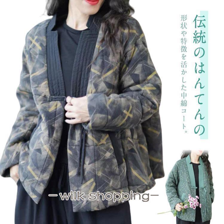 羽織り 暖かい 袢纏 はんてん レディース ルームウェア 防寒 Vネック 幾何柄 おしゃれ 上着 中綿ジャケット 半纏 中綿コート アウター ファッシ