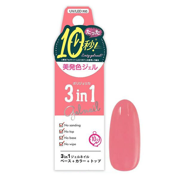忙しい毎日でも自宅で簡単にジェルネイルをしたい、そんな方にオススメです。コレ1本でベース・カラー・トップの3役で便利♪ 製造国:中国 素材・材質:ボトル:ガラスキャップ:PPブラシ柄:PEブラシ:ナイロン 成分:ポリアクリル酸、HEMA、トリメチルベンゾイルジフェニルホスフィンオキシド、ヒドロキシシクロヘキシルフェニルケトン (+/-) 酸化チタン、酸化鉄、グンジョウ、マンガンバイオレット、酸化クロム、銀、赤201、赤223、赤227、黄5 内容量:6g 仕様:UV・LEDライト対応