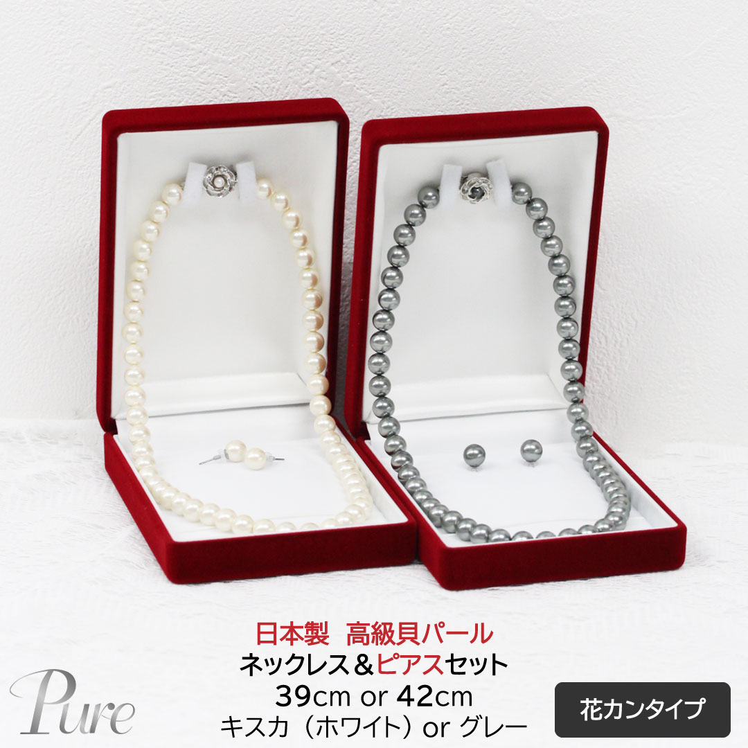 パール ネックレス ピアス セット 真珠 レディース 貝パール 白 ホワイト キスカ グレー 42cm 8mm 慶弔 兼用 フォーマル 結婚式 冠婚葬祭 葬式 葬儀