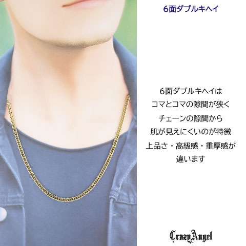 ステンレス素材では流通が少ない6面Wキヘイは、コマとコマの隙間が狭いので、チェーンの隙間から肌が見えにくく、上品さ・高級感が全然違います。