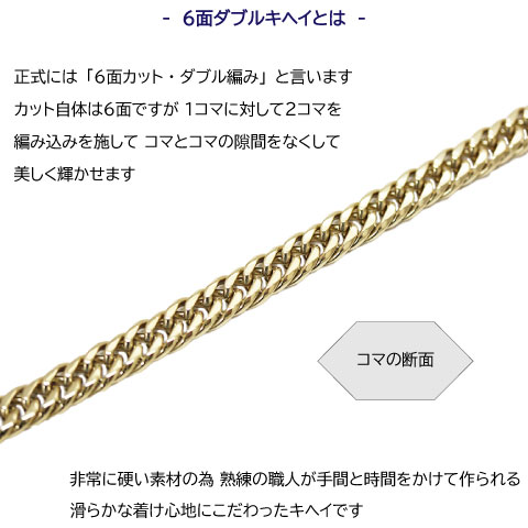ステンレス素材では流通が少ない6面Wキヘイは、コマとコマの隙間が狭いので、チェーンの隙間から肌が見えにくく、上品さ・高級感が全然違います。