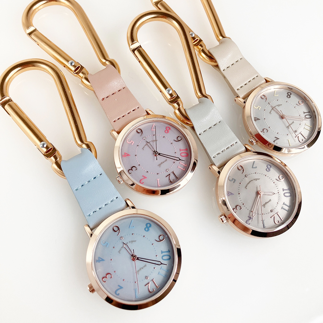 カラビナも時計ケースもピンクゴールドで統一。カラビナウォッチなので鞄やベルトに付けて外出できます。