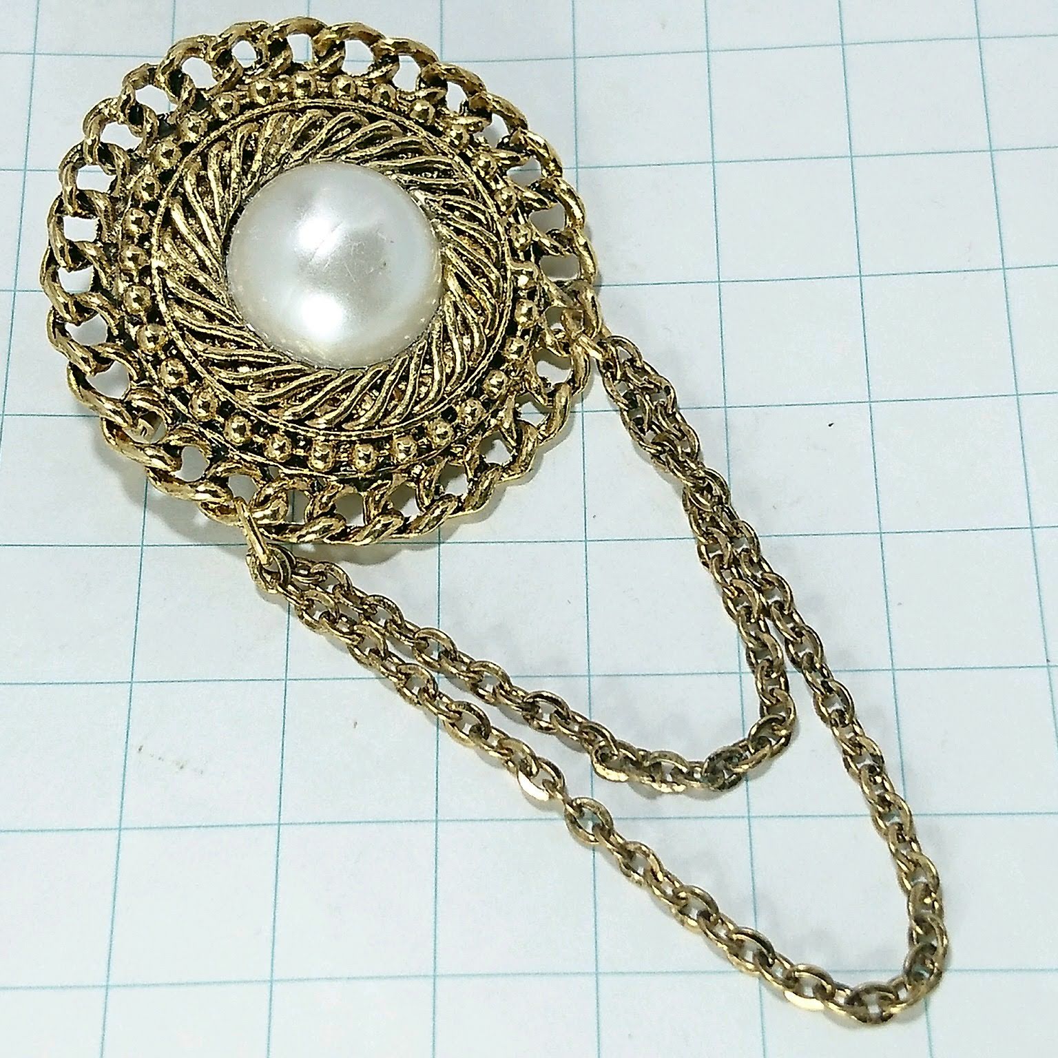 送料無料)ビンテージ☆パール フェイク チェーン☆アンティークブローチ A11195