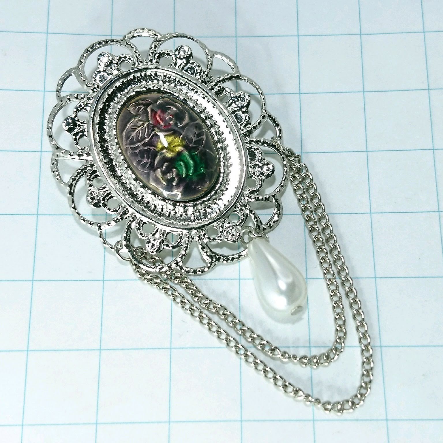送料無料)ビンテージ☆七宝焼き 薔薇モチーフ チェーンエンブレム☆アンティークブローチ A14593