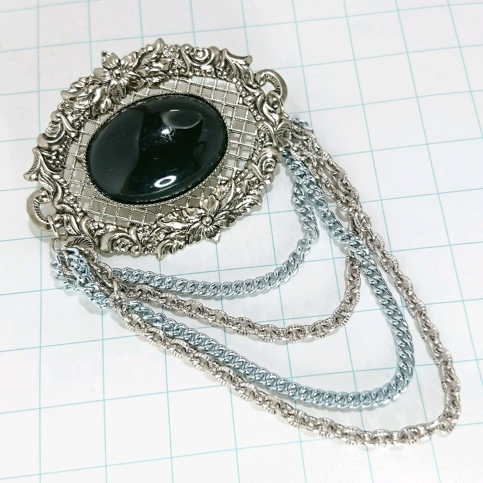 送料無料)ビンテージ☆ブラックストーン チェーン☆アンティークブローチ A17729