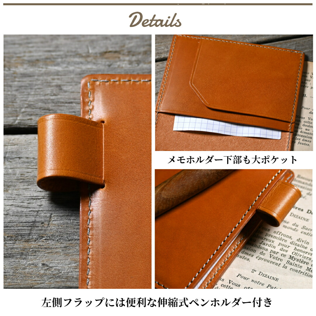 | 内面左側ポケット×1 右側ポケット×1 メモ固定ホルダー×1 伸縮ペンホルダー×1 付き |