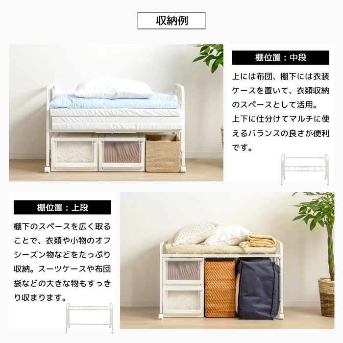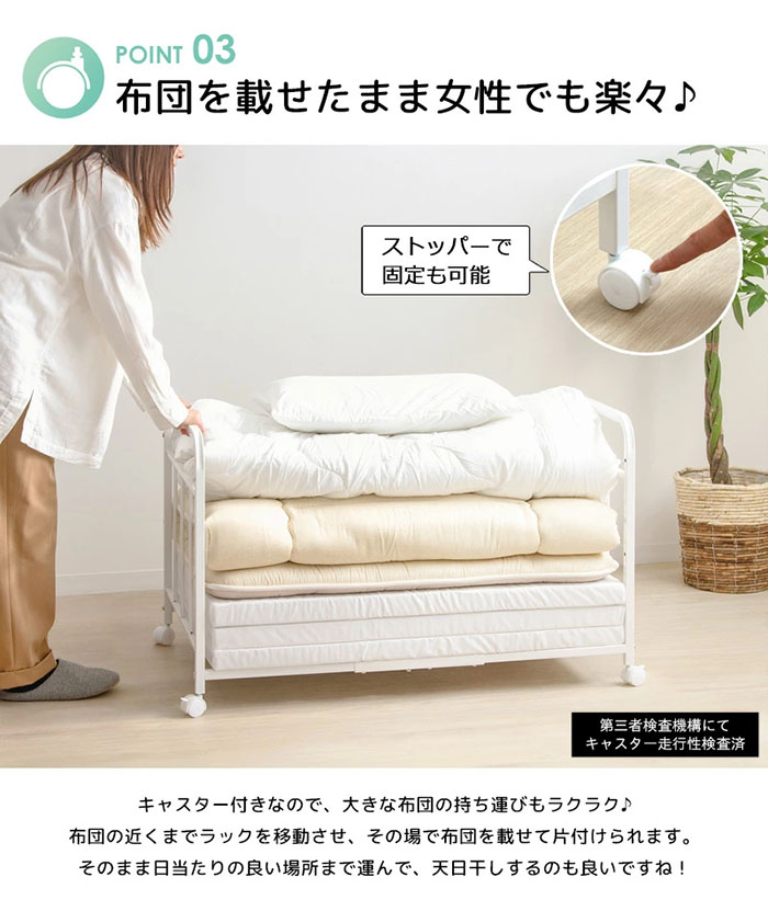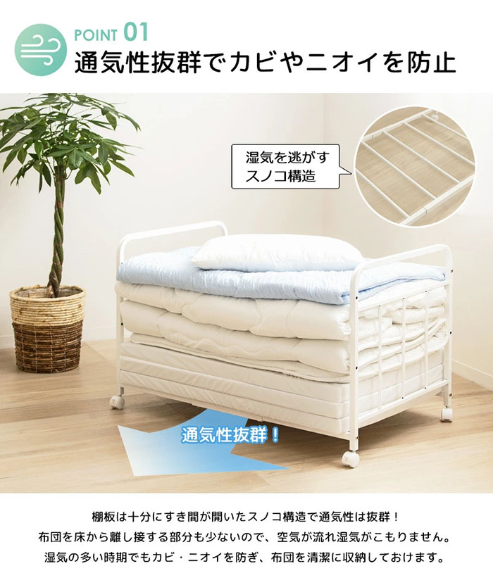 かさばる布団や毛布、マットレスをすっきり収納できる布団収納ラック。通気性抜群で、湿気やカビの心配も解消します。キャスター付きで移動も簡単、布団の上げ下げや持ち運びも楽々。棚位置は高さ調節可能、下に衣装ケースや収納ボックスを置けます。抜群の収納力で押入れやクローゼット内の整理に最適。お掃除ロボットやフローリングワイパーが通れる高さで、ホコリの溜まりも防止します。
