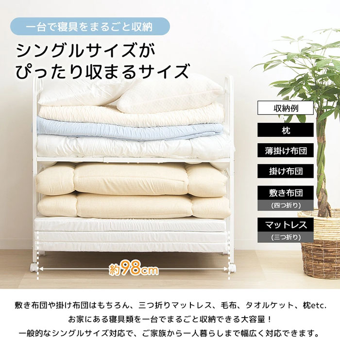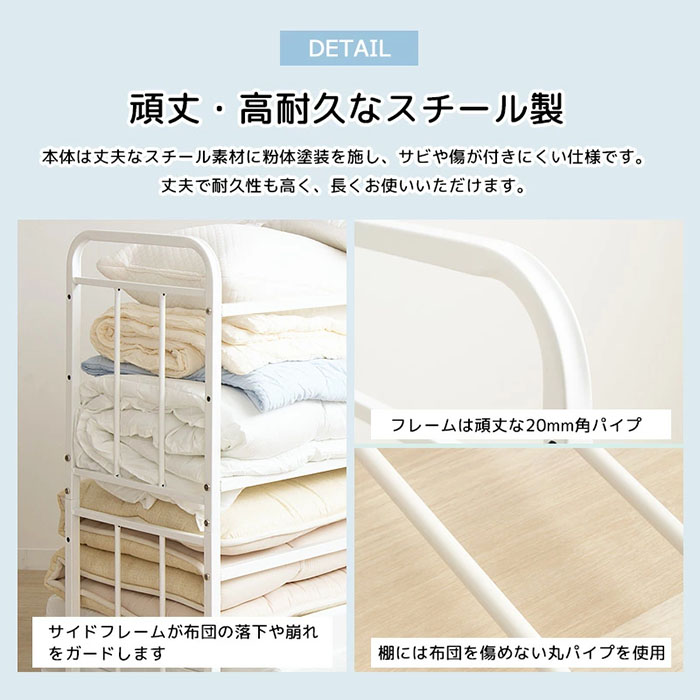 かさばる布団や毛布、マットレスをすっきり収納できる布団収納ラック。通気性抜群で、湿気やカビの心配も解消します。キャスター付きで移動も簡単、布団の上げ下げや持ち運びも楽々。棚位置は高さ調節可能、下に衣装ケースや収納ボックスを置けます。抜群の収納力で押入れやクローゼット内の整理に最適。お掃除ロボットやフローリングワイパーが通れる高さで、ホコリの溜まりも防止します。
