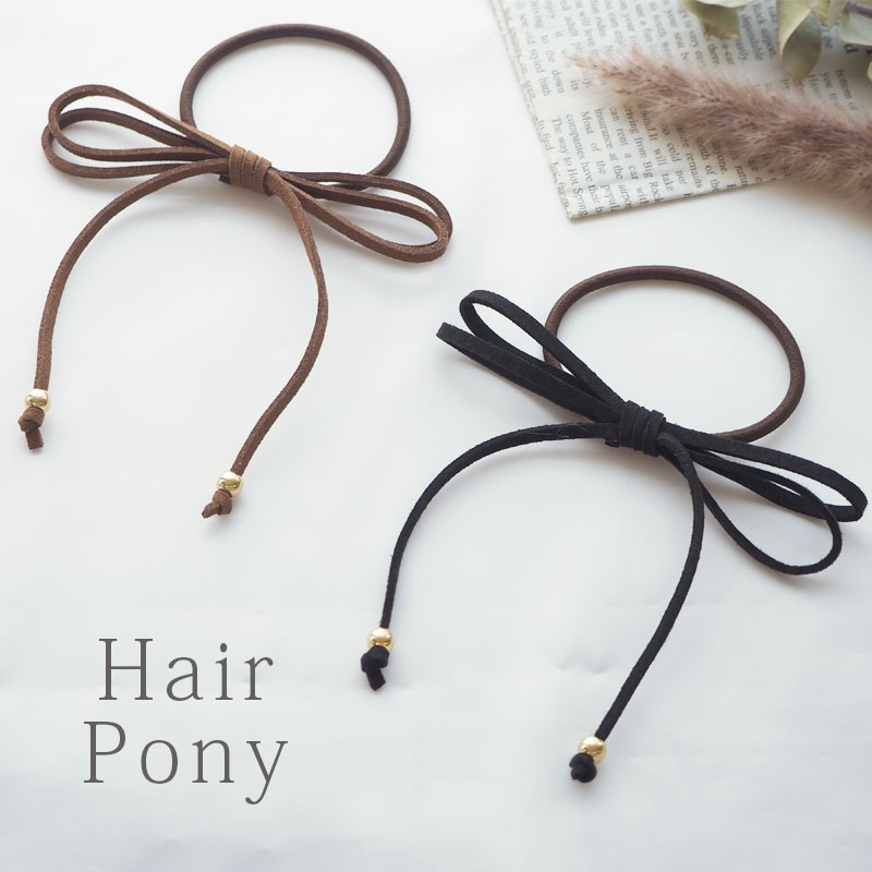 【ヘアポニー PUレザー 合皮 紐 スエード調 髪留め りぼん トレンド おしゃれ 可愛い カジュアル 大人っぽい 秋冬 簡単 ヘアアレンジ 普段使い ブラック ブラウン】
