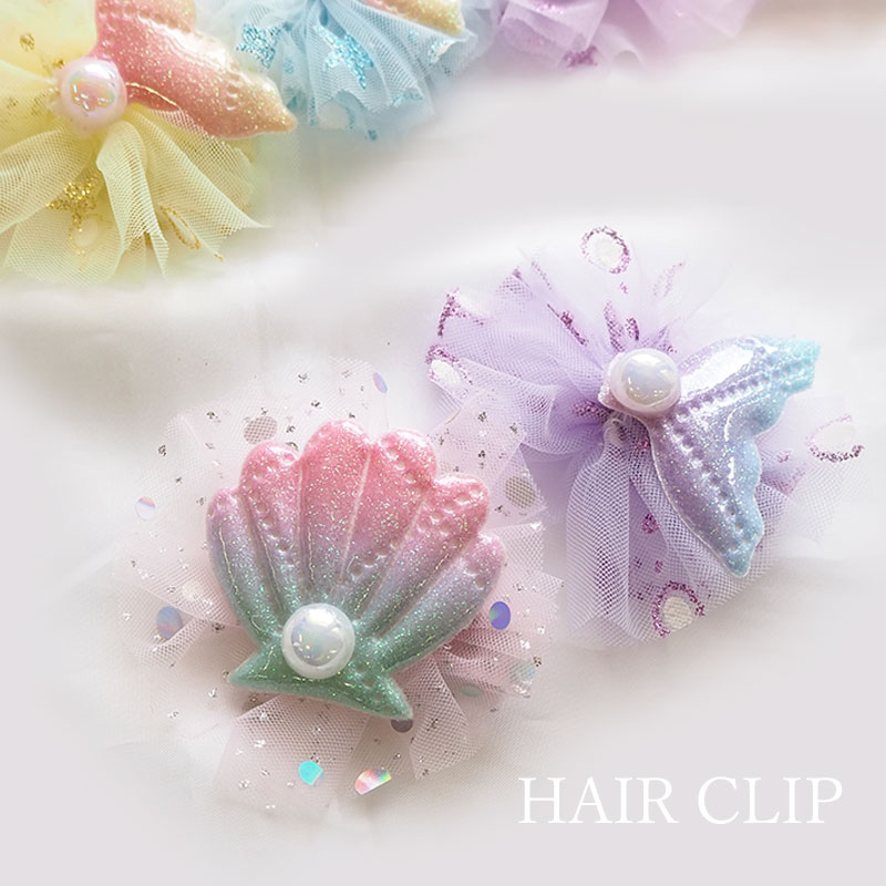 ヘアクリップ ラメ グラデーション チュール シェル テール ヘアアクセサリー 髪留め 髪飾り まとめ髪 子供 キッズ かわいい おしゃれ 大きめ 小学生 幼稚園