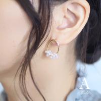 【スタッフコメント】淡いピンクかかった小粒パールを使ったデザインピアスです。エレガントな装いにもよく合うので、お出かけやデートなどにオススメです♪