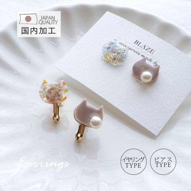 ピアス& イヤリング ねこ パール 猫 かわいい 可愛い おしゃれ アクセサリー パール 淡水パール レジン 国産 日本製 フラワー 花 スタッドピアス ゴールド 両耳