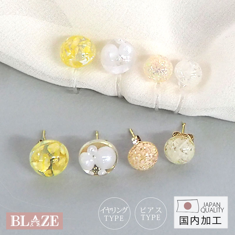 ピアス イヤリング 4個セット ミモザ 花 ドライフラワー ぷっくり レジン ノンホールピアス 樹脂イヤリング かわいい おしゃれ 上品 レディース 日本製 国産
