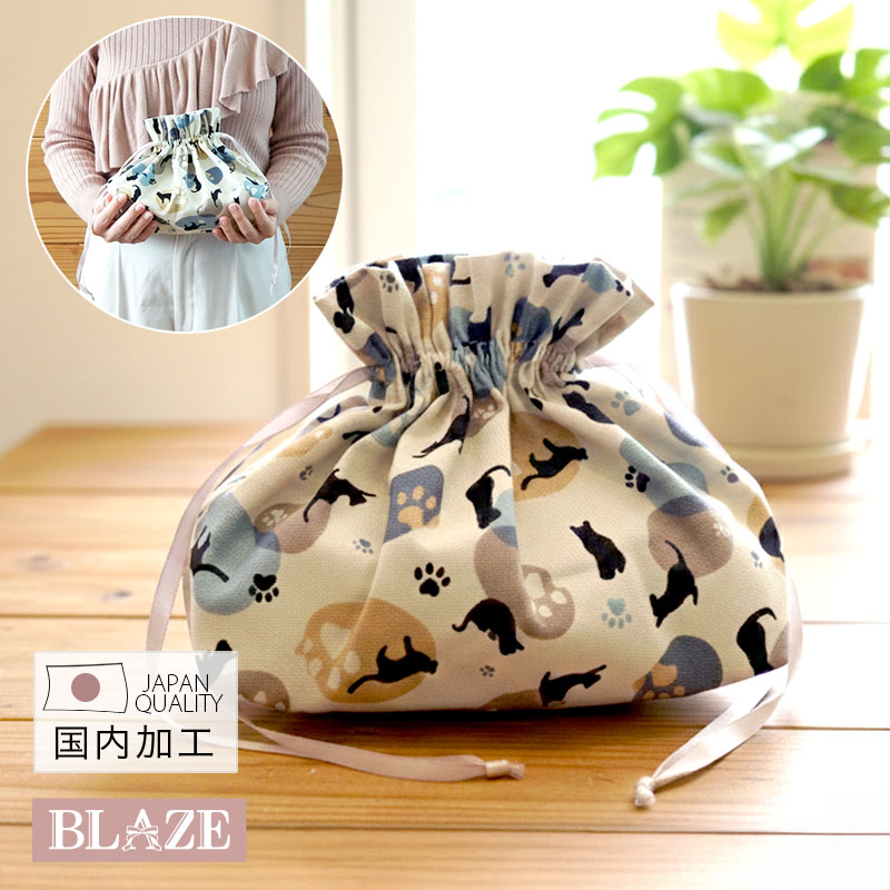 巾着 ポーチ 猫 ねこ 大きめ マチ広 かわいい おしゃれ ランチポーチ バッグインバッグ ギフト プレゼント ネコ 日本製 国産 BLAZE