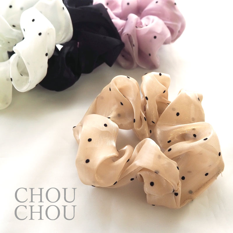 【スタッフのコメント】光沢のあるオーガンジーを使用したドット柄のシュシュです。