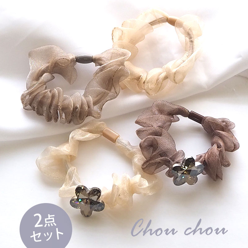 2個入り シュシュ オーガンジー フラワー 2本 セット 花 キラキラ ビジュー 細め 小さめ ヘアゴム ヘアアクセサリー まとめ髪 大人 キラキラ ビジュー ストーン
