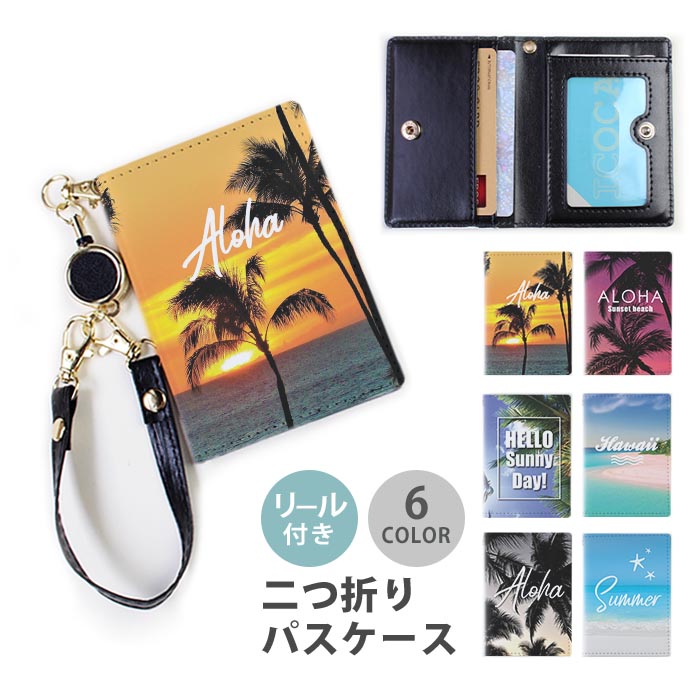 パスケース リール付き 定期券入れ 二つ折 可愛い ハワイアン 夕焼け ヤシの木 海 砂浜 ビーチ 2枚 3枚 定期入れ 中が見えない 二つ折り リールパスケース
