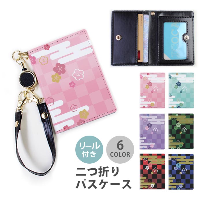パスケース リール付き 定期券入れ 二つ折 可愛い 和風 和柄 市松模様 格子柄 桜 2枚 3枚 定期入れ 中が見えない 二つ折り リールパスケース
