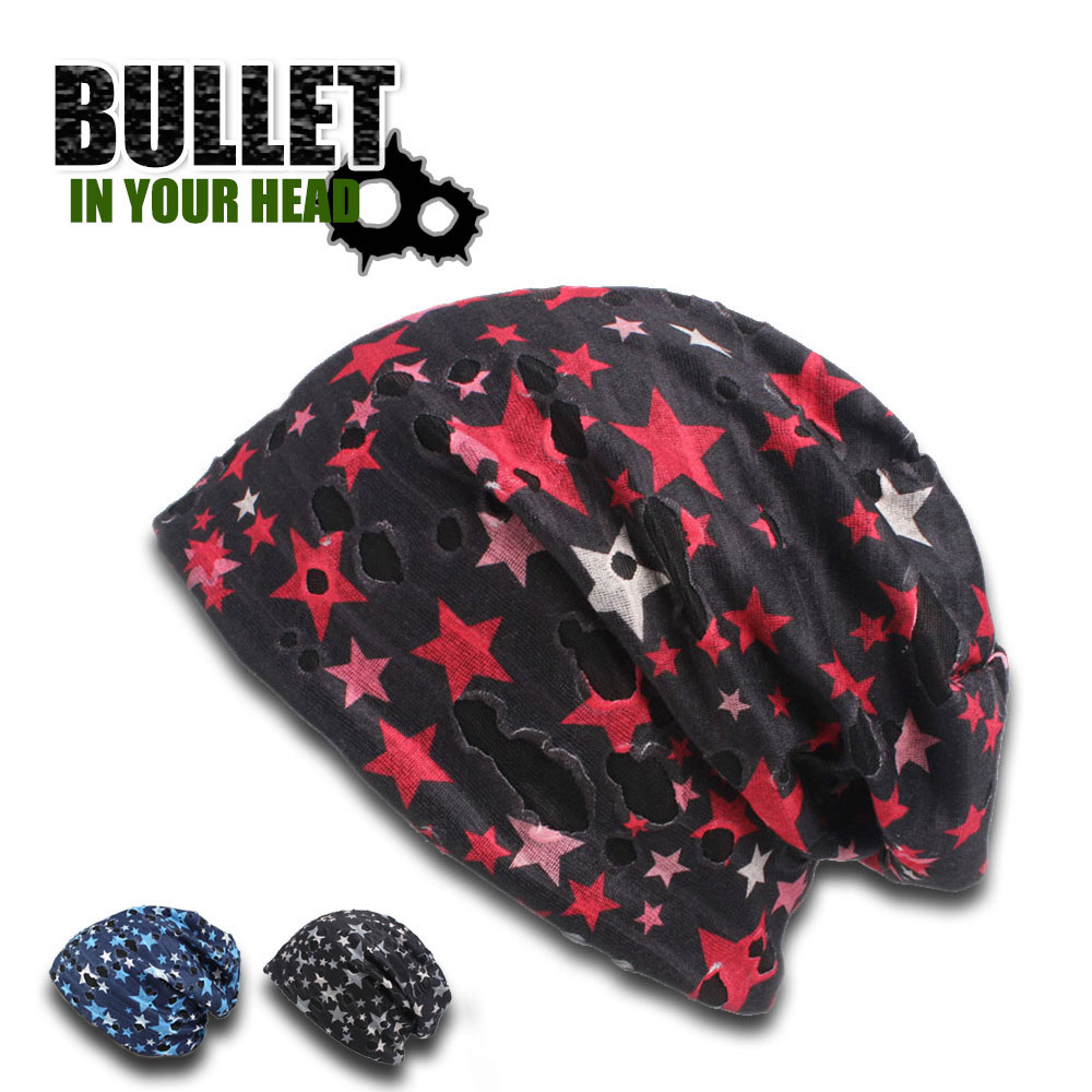 ダメージとマルチスター柄の快適なダメージビーニー。