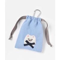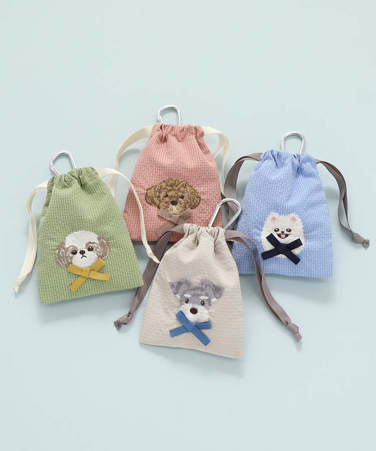 立体的なリボンを付けたワンちゃんの刺繍が愛らしい、ブルーブルーエオリジナル巾着。