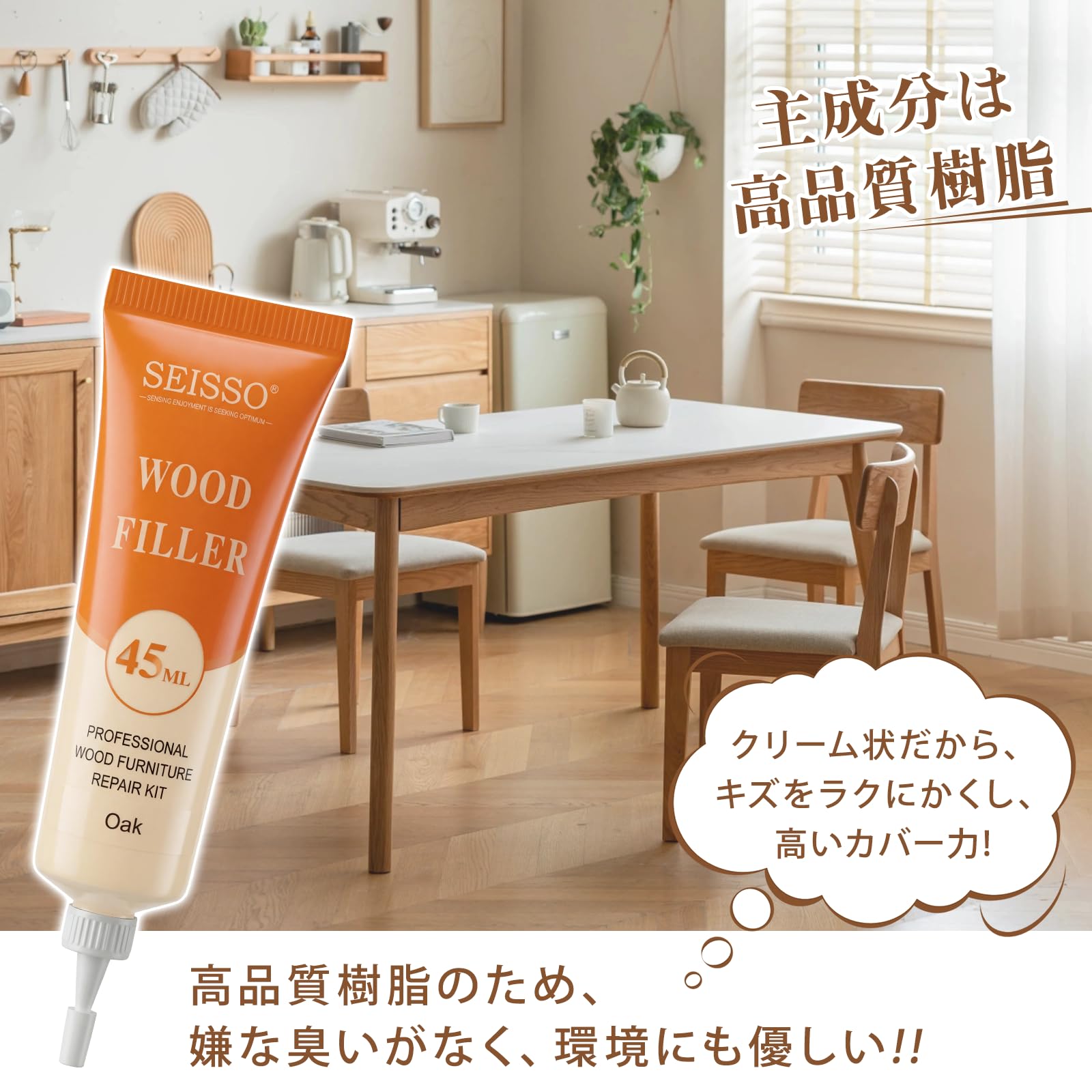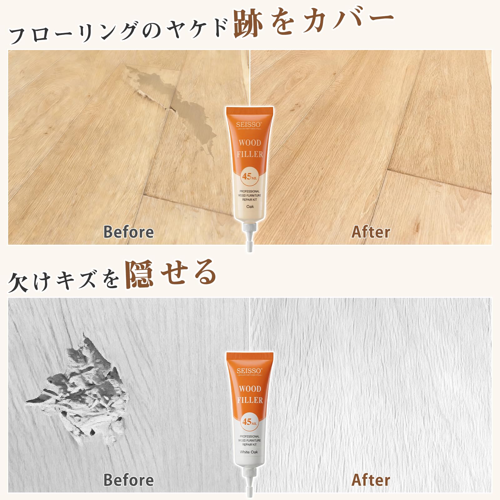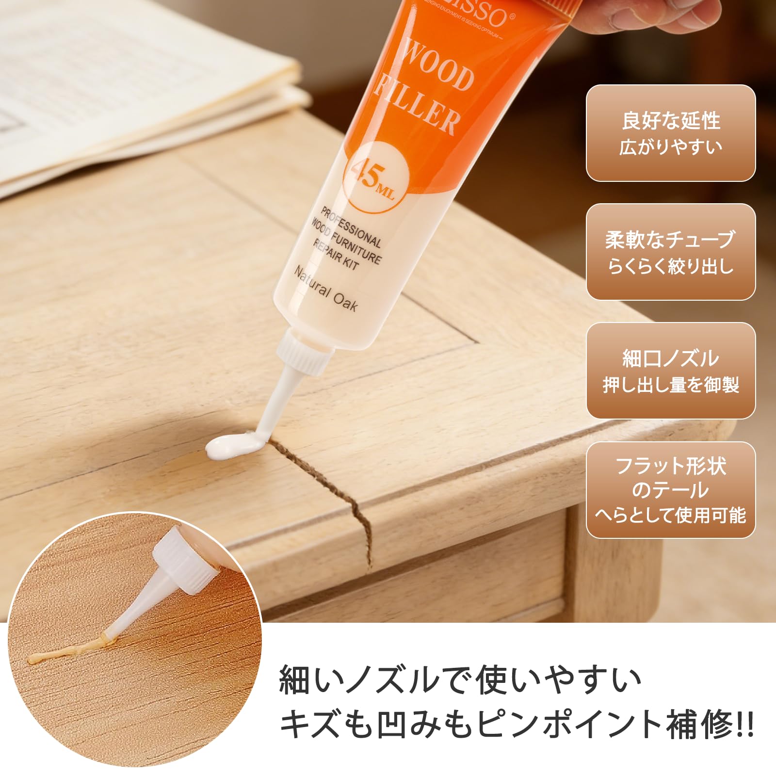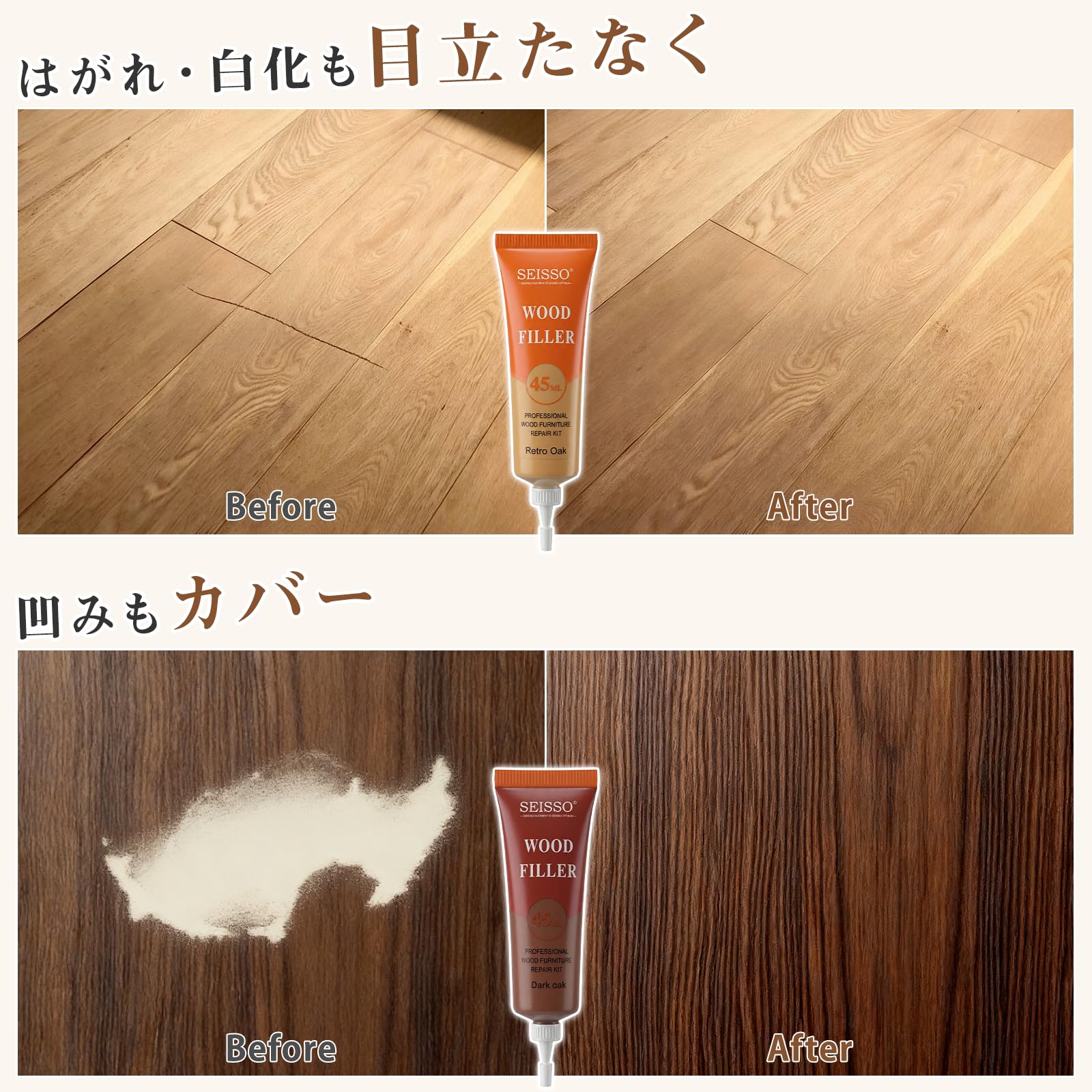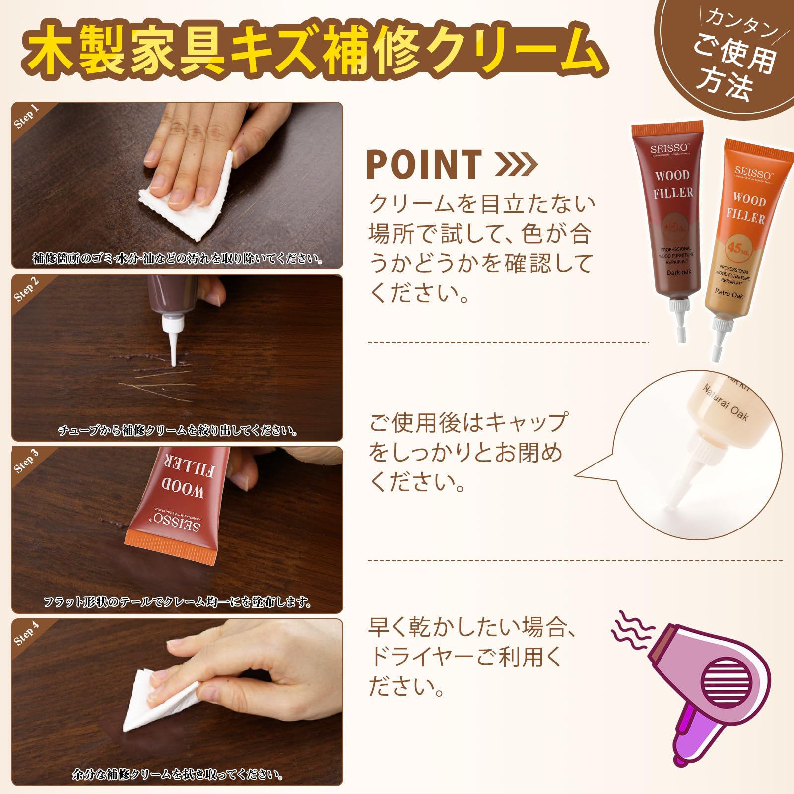 | 1.補修箇所のゴミ水分油などの汚れを取り除いてください。2.チューブから補修クリームを絞り出してください。3.フラット形状のテールでクレーム均一にを塗布します。4.余分な補修クリームを拭き取ってください。早く乾かしたい場合、ドライヤーご利用ください。 専門業者に頼まずに木製家具についた傷を自分の力で補修することができ、古いアイテムを新しいものに改修することで時間とお金を節約することもできます。 ご注意:▲小さなキズの補修にのみ適用し、大きいキズの補修には適用しないです。▲所定の用途以外には使用しないでください。▲涼しく乾燥した場所に保管してください。▲湿度の高い日(雨の日など)に本制品を使用しないでください。 |