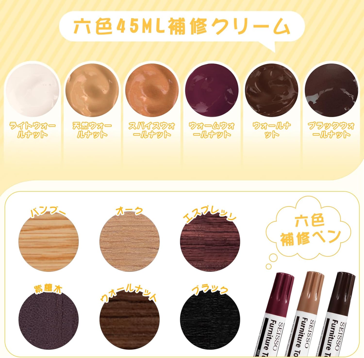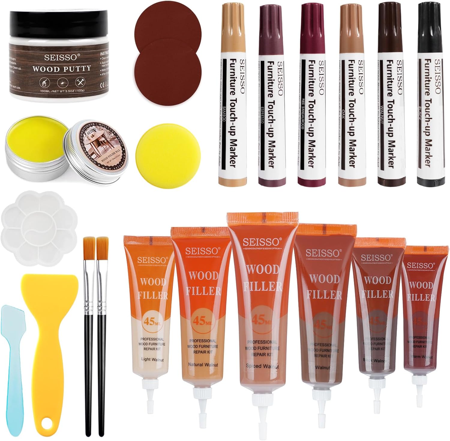 | 六色45ML補修クリーム、六色補修ペン、100gホワイトパテ*1、25g木材ワックス*1、スクレーパー*2、ブラシ*2、サンドペーパー*2、スポンジ*1、パレット*1。(全22枚セット) |