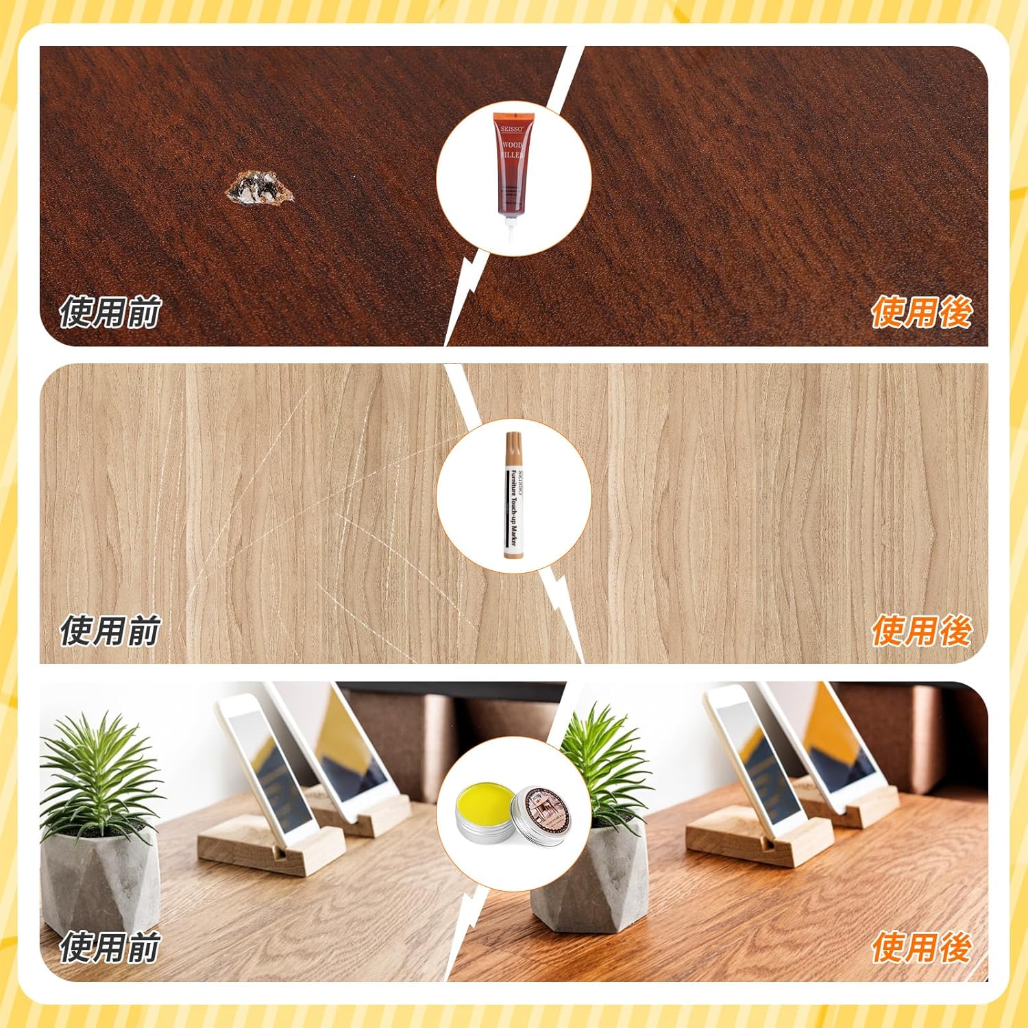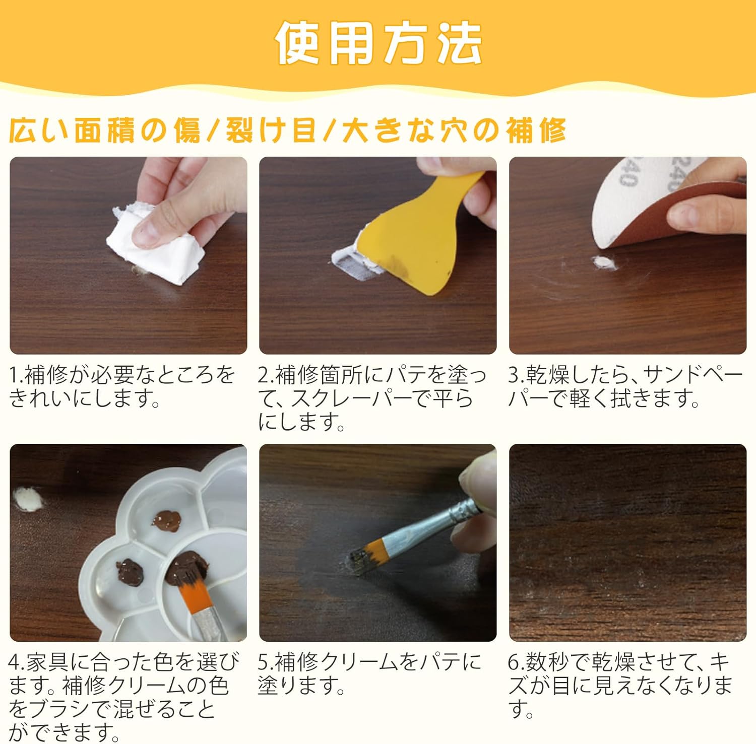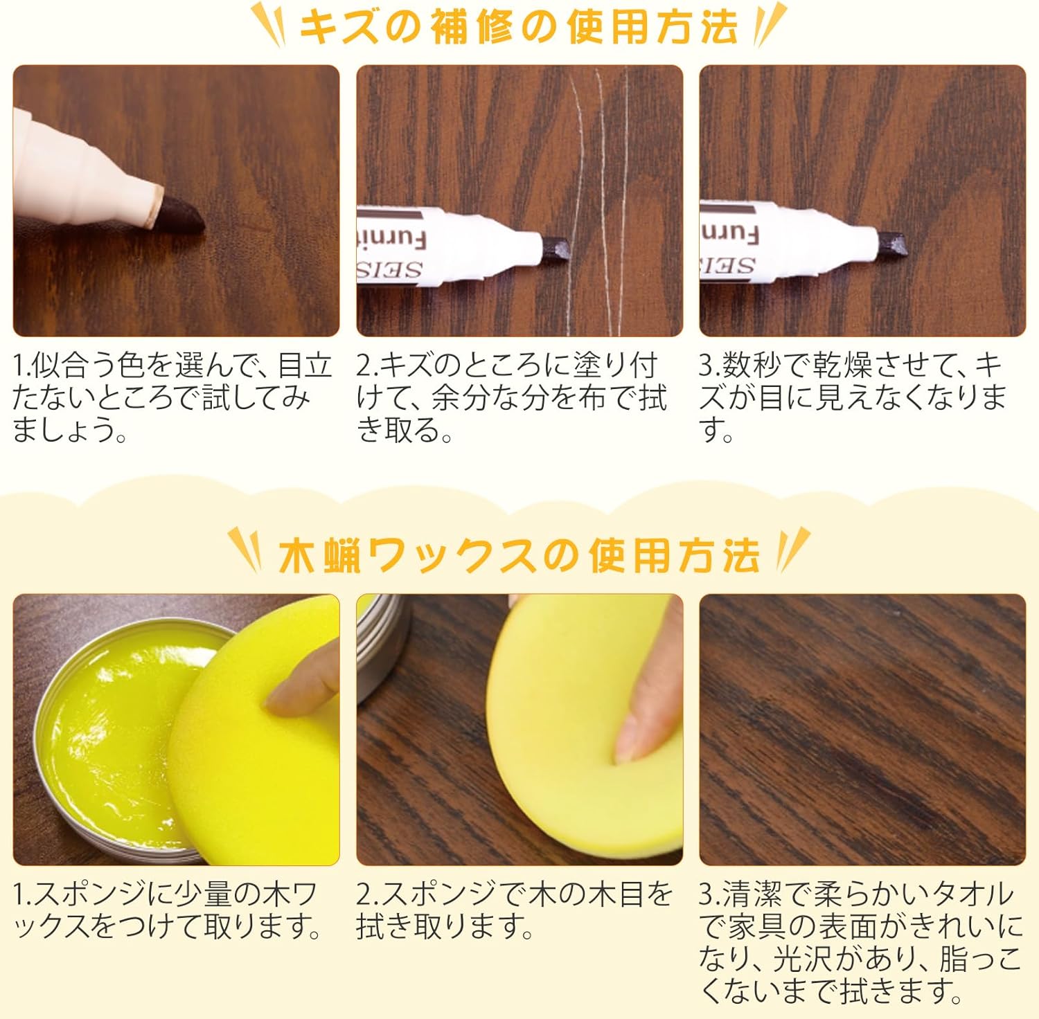| この補修キットは、木製の床、木製のドア、家具(キャビネット、椅子、クローゼット、本箱、机、木製工芸品など)の傷、ひび割れ、欠け、穴、変色などの木材のすべてのタイプの損傷を修復するのに役立ちます。 この木材用キズ補修クリームがあれば、専門業者に頼まずに自分で修復することができます。 ▲涼しく乾燥した場所に保管してください。▲使用するたびにフタで密封してください。▲お客様のモニター環境により、実際の商品の色合いと多少異なって見える場合がございます。▲何かご不明な点がございましたら、いつでもお気軽に弊社までお問い合わせください。 |