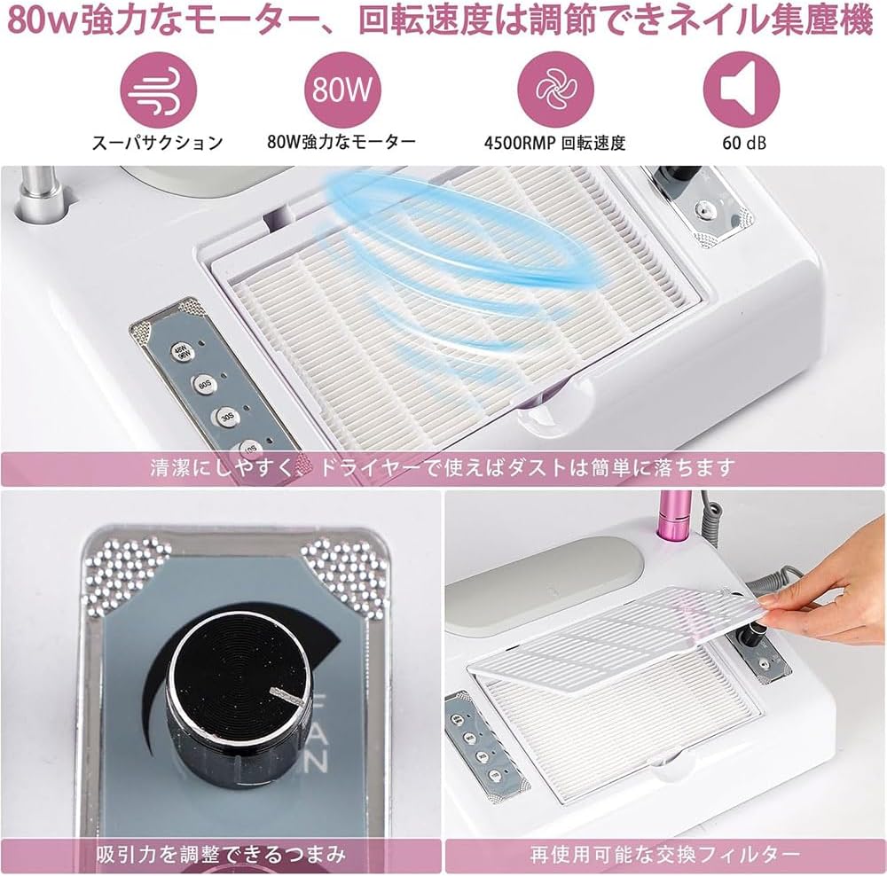 | フィルターの交換は簡単で、繰り返し使用できます。クリーニングの際は、フィルターを取り外し、ダストを振り落とすだけで可能です。さらに、交換用フィルターも付属しております。 電動ネイルマシンは高品質な回転モーターを搭載しており、長時間使用できます。爪周りの角質をスムーズに研磨・除去でき、スピードと回転方向を調整可能で、左右両手で使いやすい設計です。 お買い上げ日より、3ヶ月間の安心保障をご提供いたします。 |