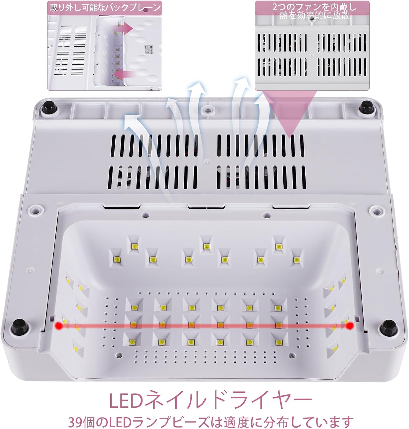 | 本体*1(ネイルライト・ネイルダストコレクター・電動ネイルマシン)、アダプター*1、ネイル用電灯*1、電動ネイルマシンビット*6、電動ネイルマシンサンディングバンド*20、ダストブラシ*1、爪やすり*1、説明書*1 電圧:100V-240V 出力:80W 音圧レベル:60-75dB 材質:プラスチック・ステンレス・メタル |