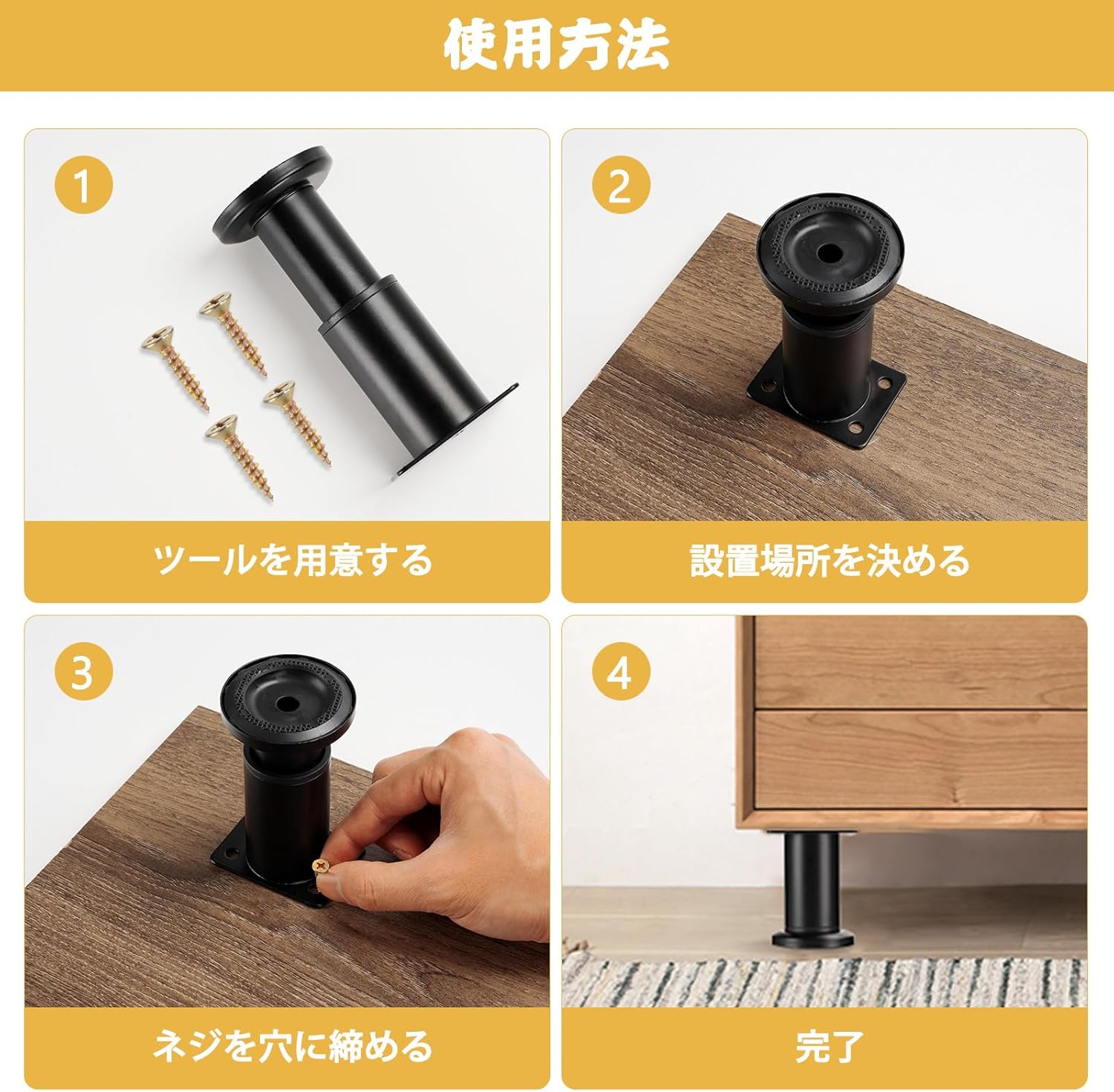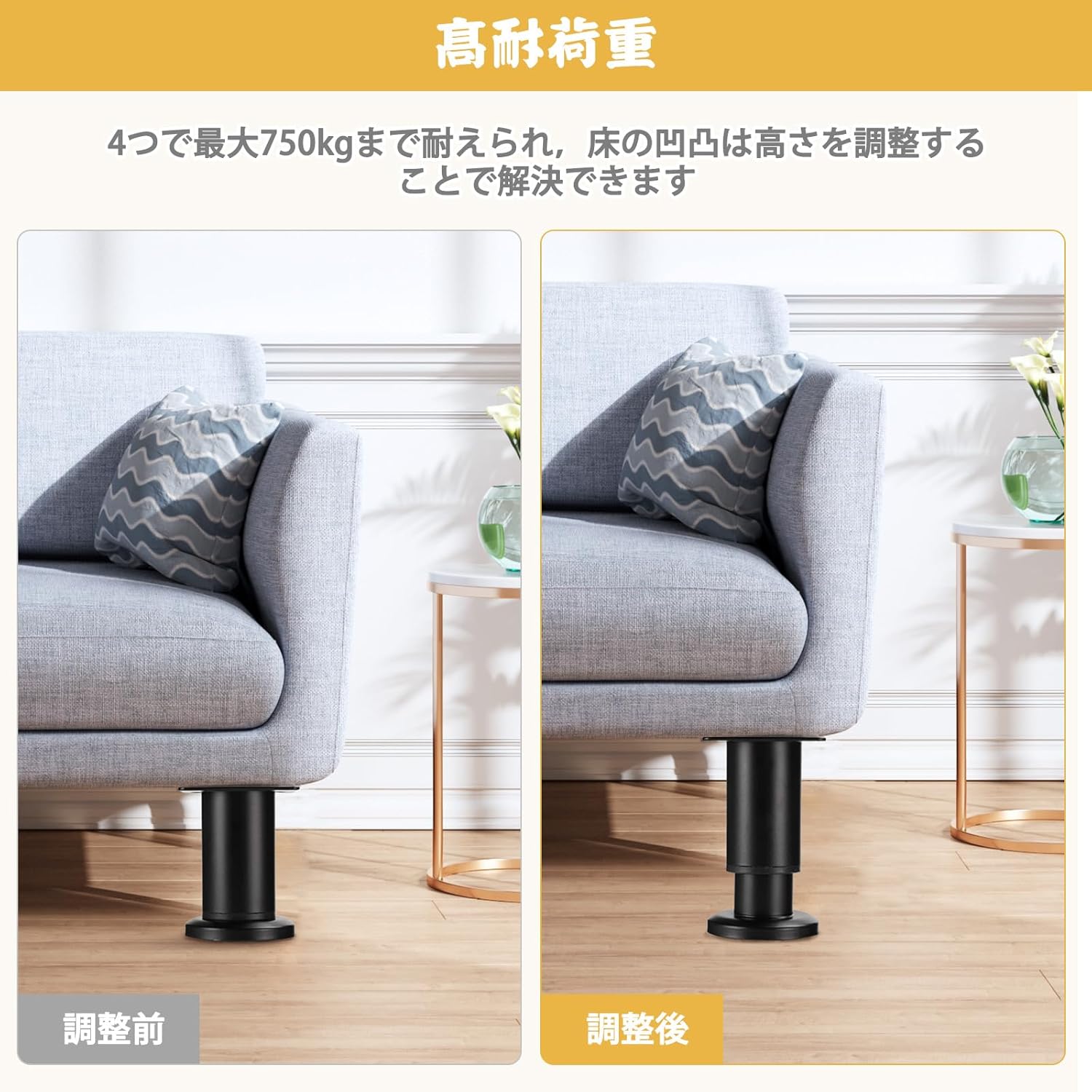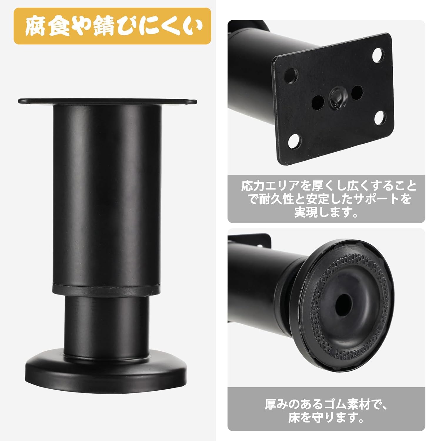 | 高品質の冷間圧延鋼板で作られ、表面は多層の厚いコーティングで処理されており、優れた耐食性と防錆性を備えています。底部には高品質のゴムパッドが使用されており、滑りを防ぎます。 家具の脚取り付けブラケットには4つの事前に開けられた穴があり、簡単に直接取り付けることができます。回転して高さを調節できるので、地面が凸凹していても大丈夫です。取り付ける際はネジの長さが天板を貫通しないように注意してください。 家具の脚は多目的で、家具の高さを簡単に調整できます。ソファ、キッチンカウンター、バスルームやベッドなどさまざまな生活シーンにも適しています。 |