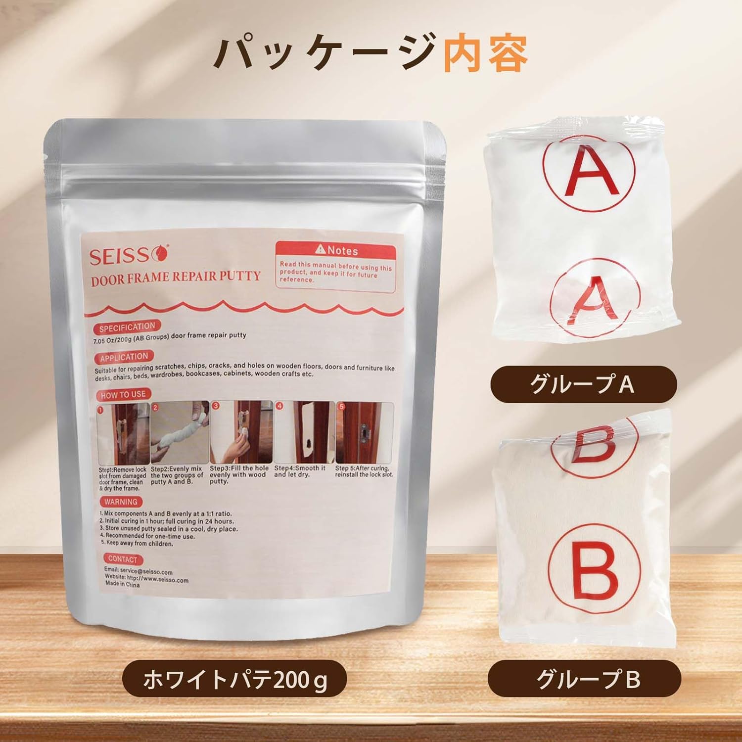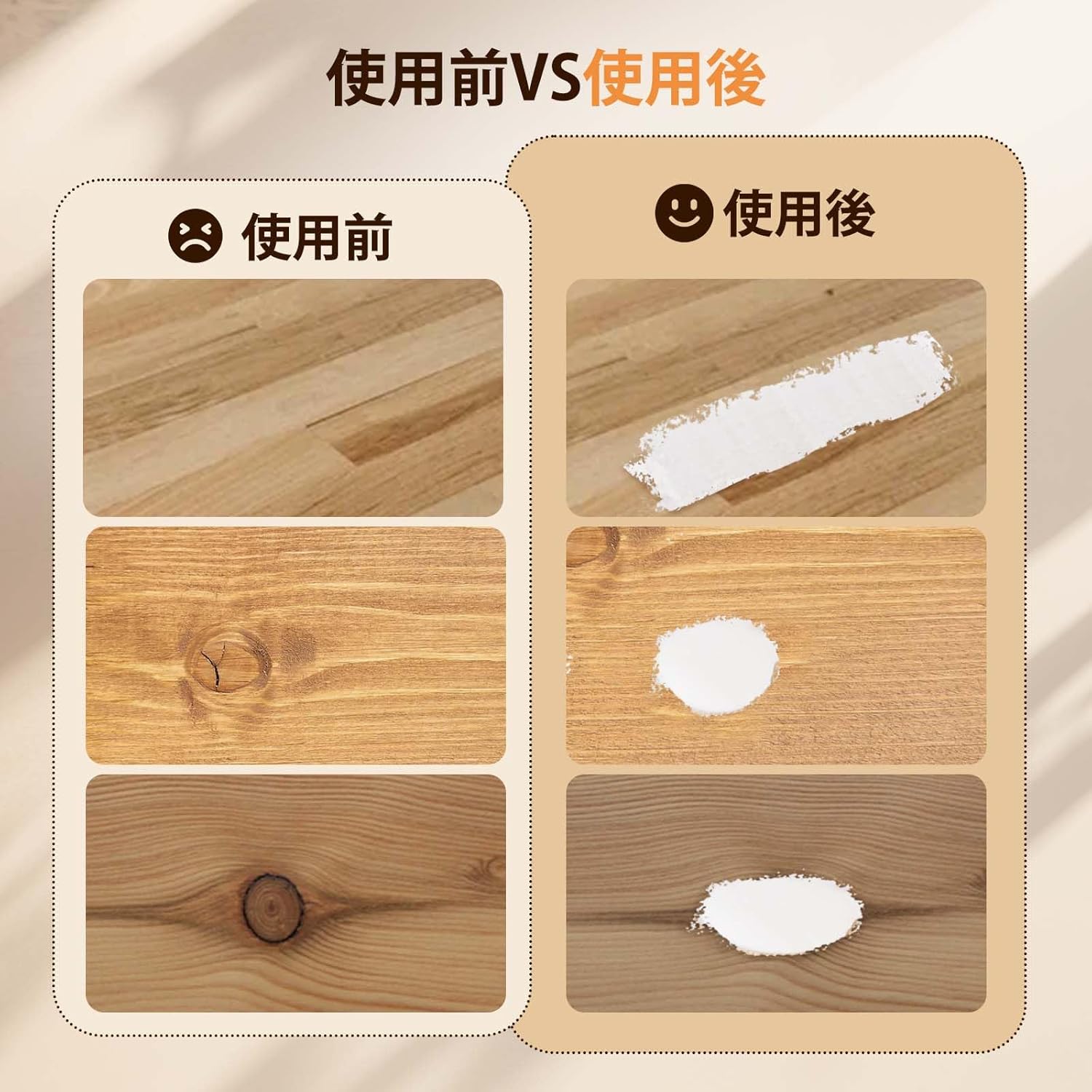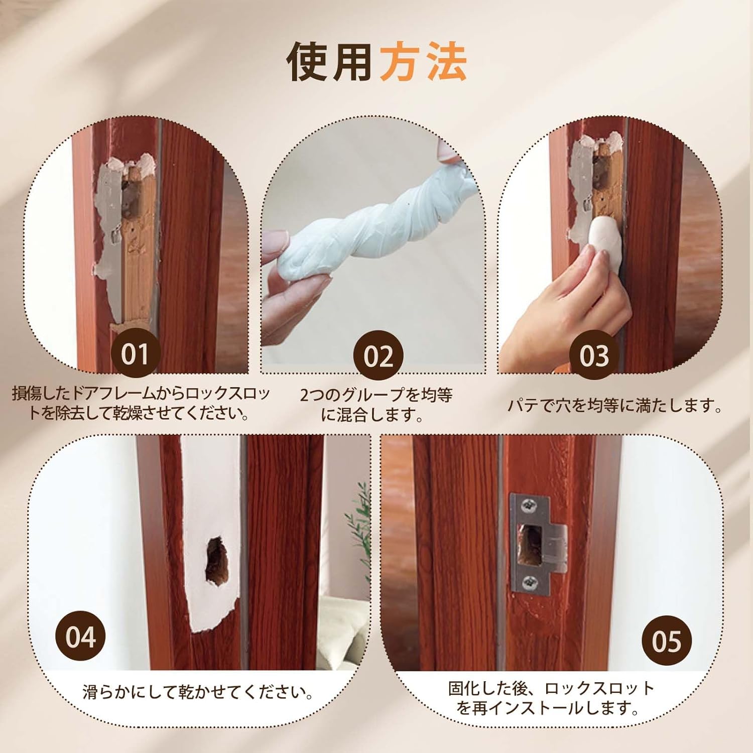 | 木戸の穴割れ、鍵穴ロック溝の脱落、木製家具戸棚ドア複合板などの木器の補修に用いられる。 1.破損箇所をきれいにし、乾燥させたままにします。2.等量のパテを取り、手に少量の水がある状態を維持してパテを均一に混合する3.混合したパテを破損箇所に埋めます。4.木製補修ペン(あるいは補修クリーム)を用いて着色します。5.乾燥を待てばよい。 1.混合する場合、AB成分は1:1比列で混合する。2.混合後常温で1時間程度で硬化し、完全硬化には24時間程度かかる。3.未使用のパテは密封して日陰乾燥所に保管し、子供やペットの接触を避け、使い捨てを提案します。 |