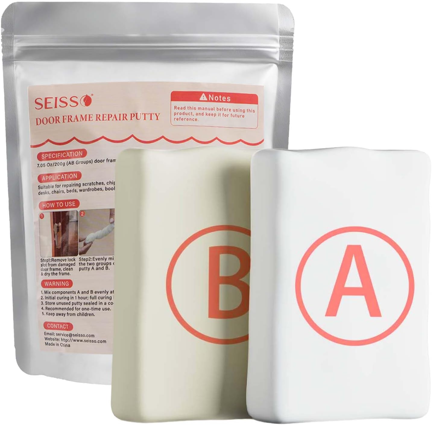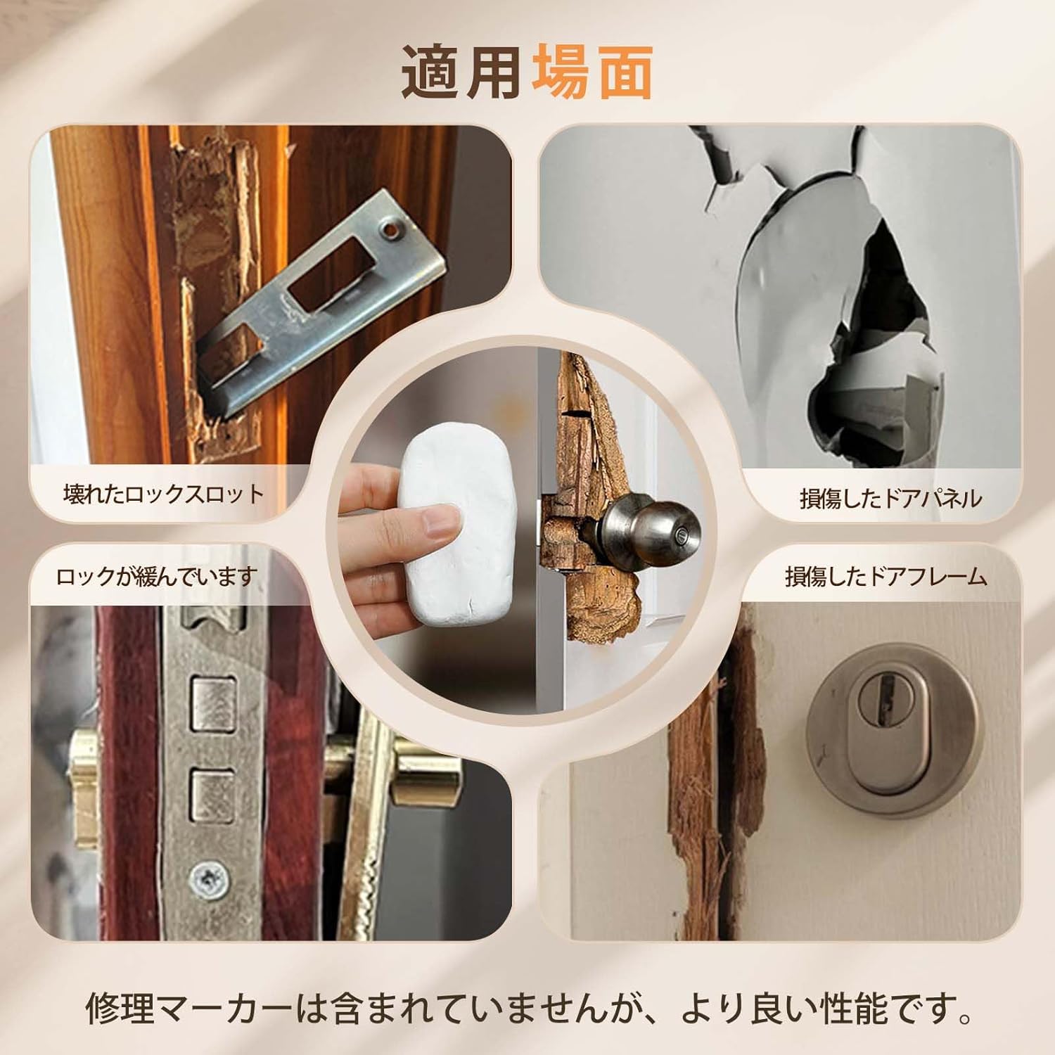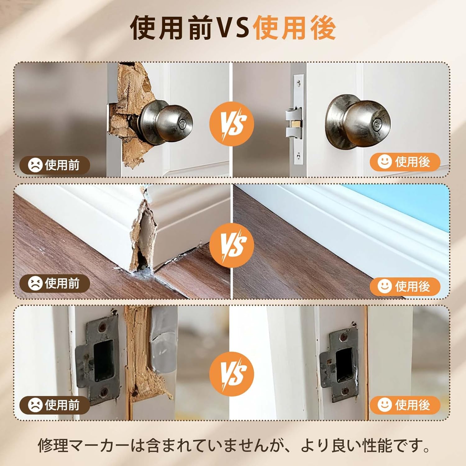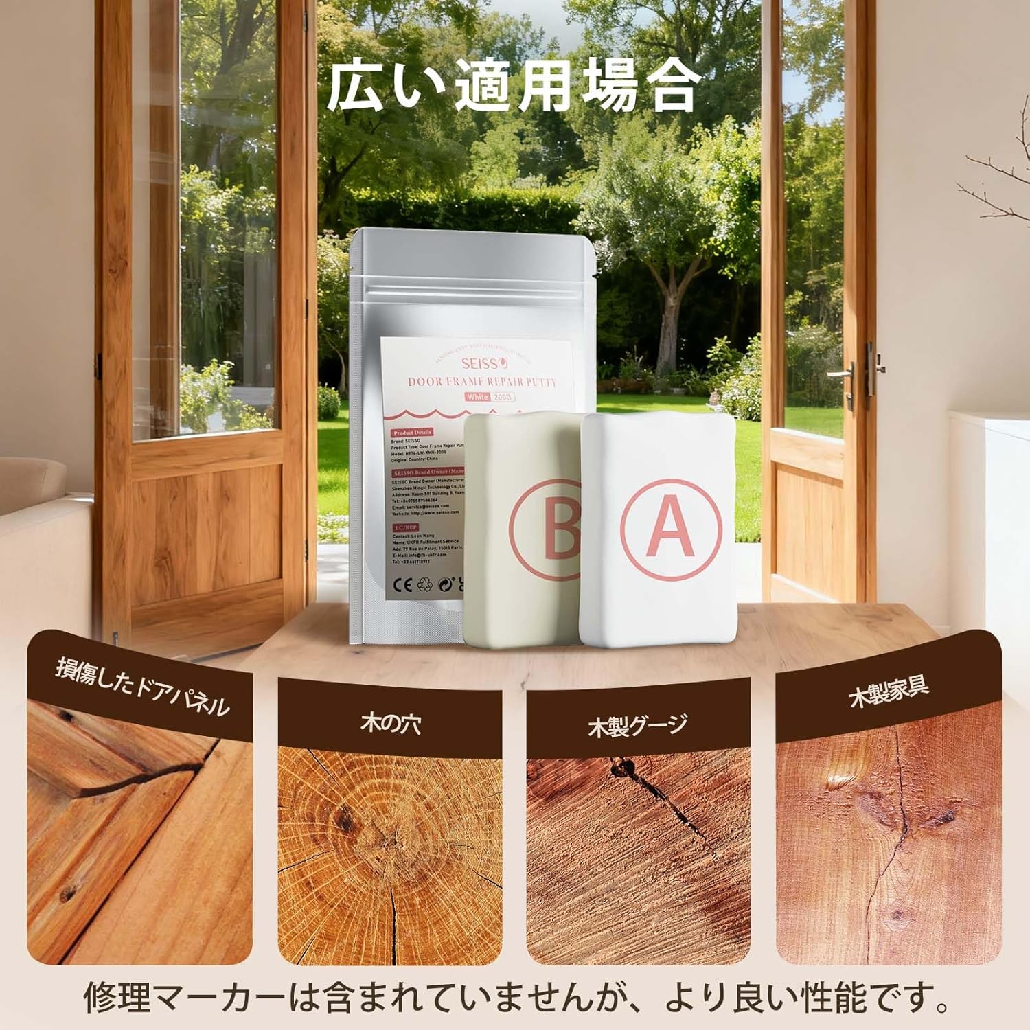 | 木戸の穴割れ、鍵穴ロック溝の脱落、木製家具戸棚ドア複合板などの木器の補修に用いられる。 1.破損箇所をきれいにし、乾燥させたままにします。2.等量のパテを取り、手に少量の水がある状態を維持してパテを均一に混合する3.混合したパテを破損箇所に埋めます。4.木製補修ペン(あるいは補修クリーム)を用いて着色します。5.乾燥を待てばよい。 1.混合する場合、AB成分は1:1比列で混合する。2.混合後常温で1時間程度で硬化し、完全硬化には24時間程度かかる。3.未使用のパテは密封して日陰乾燥所に保管し、子供やペットの接触を避け、使い捨てを提案します。 |