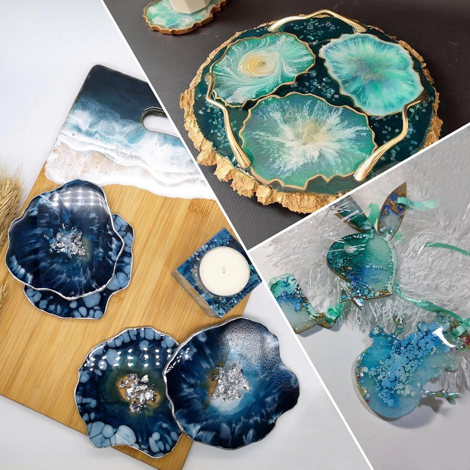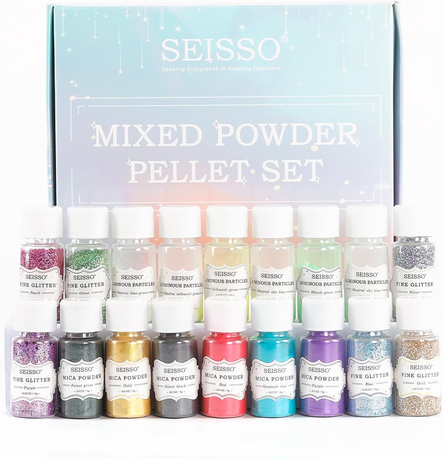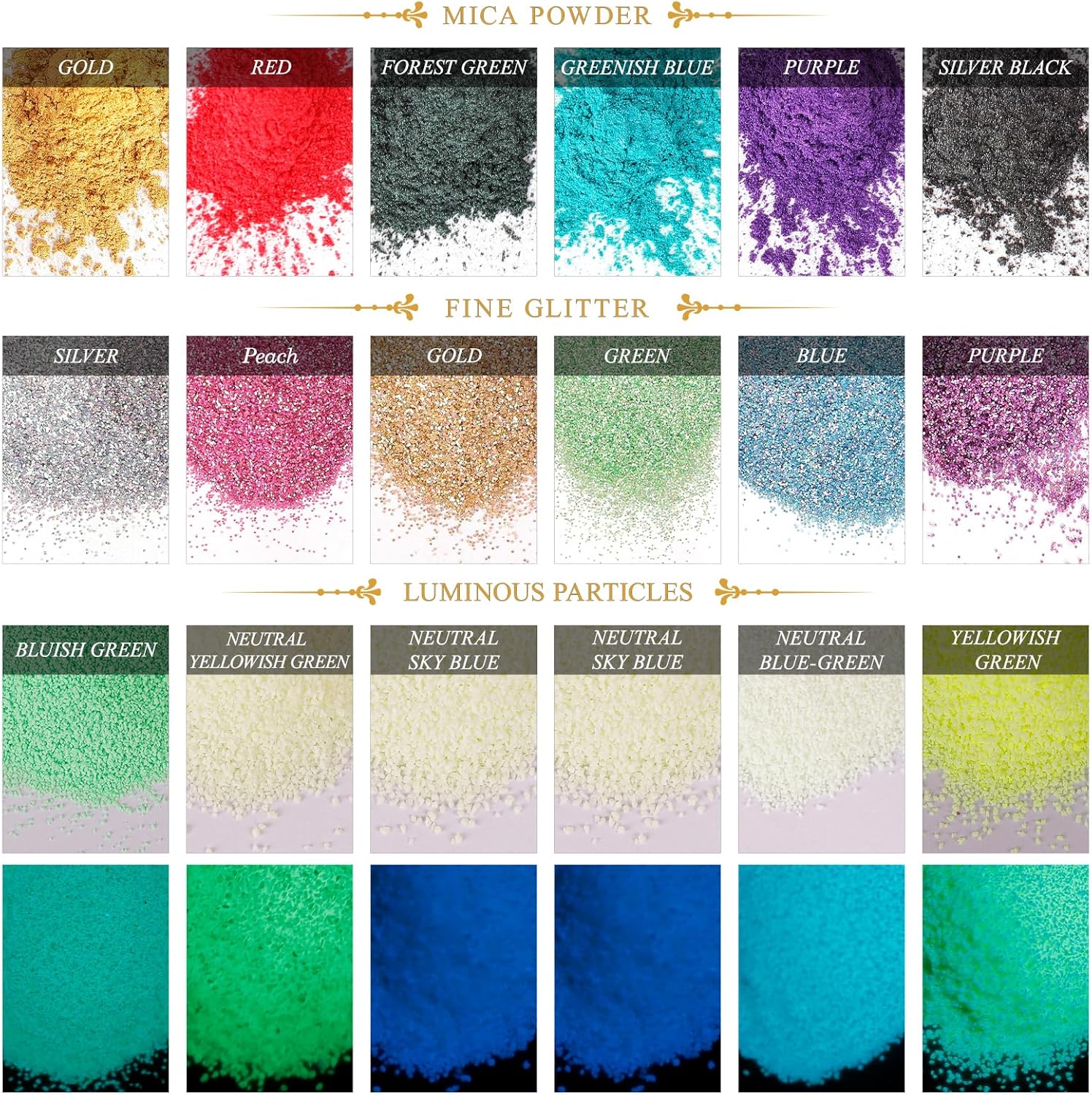 | 3種類の発光フラスコパウダーが18本入っています。マイカパウダー6色(5g入り):ゴールド、レッド、フォレストグリーン、ライムブルー、パープル、シルバーブラック。夜光スパンコール6色(10g入り):シルバー、ゴールド、ピーチ、グリーン、ブルー、パープル。夜光砂5色(10g入り):ニュートラルイエローグリーン、ニュートラルスカイブルー、ニュートラルブルーグリーン、イエローグリーン、ブルーグリーン |