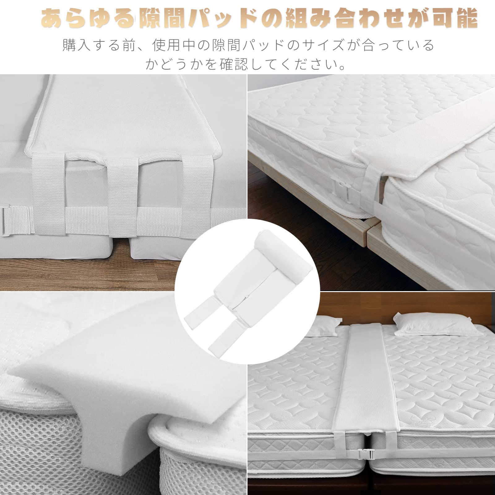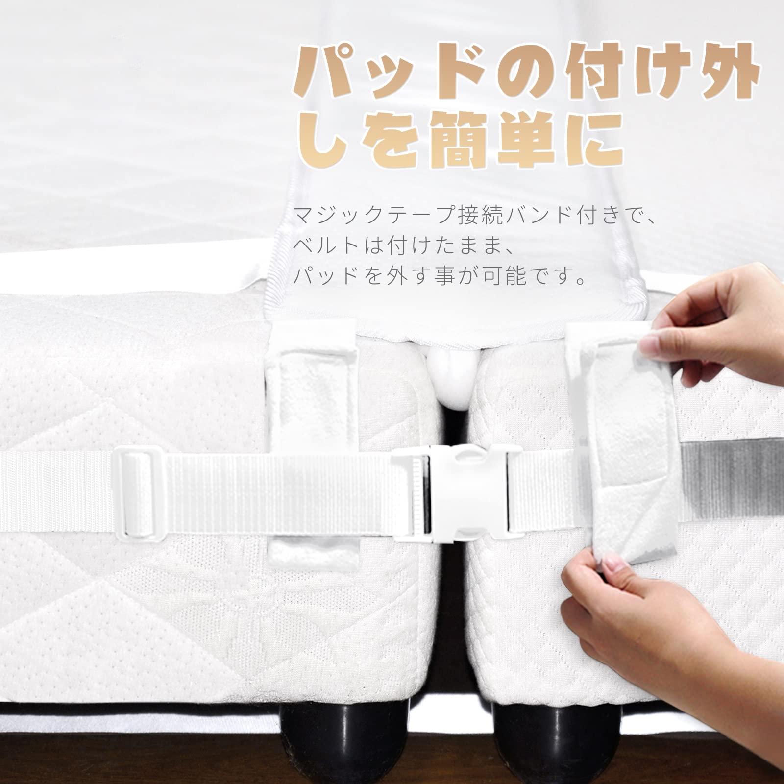 【マジックテープ接続バンド付き】マットレス用隙間パッドカバーはマジックテープ接続バンド付きで、連結ベルトが装着したままですきまパッドの取り付け、取り外しが可能で使いやすいです。