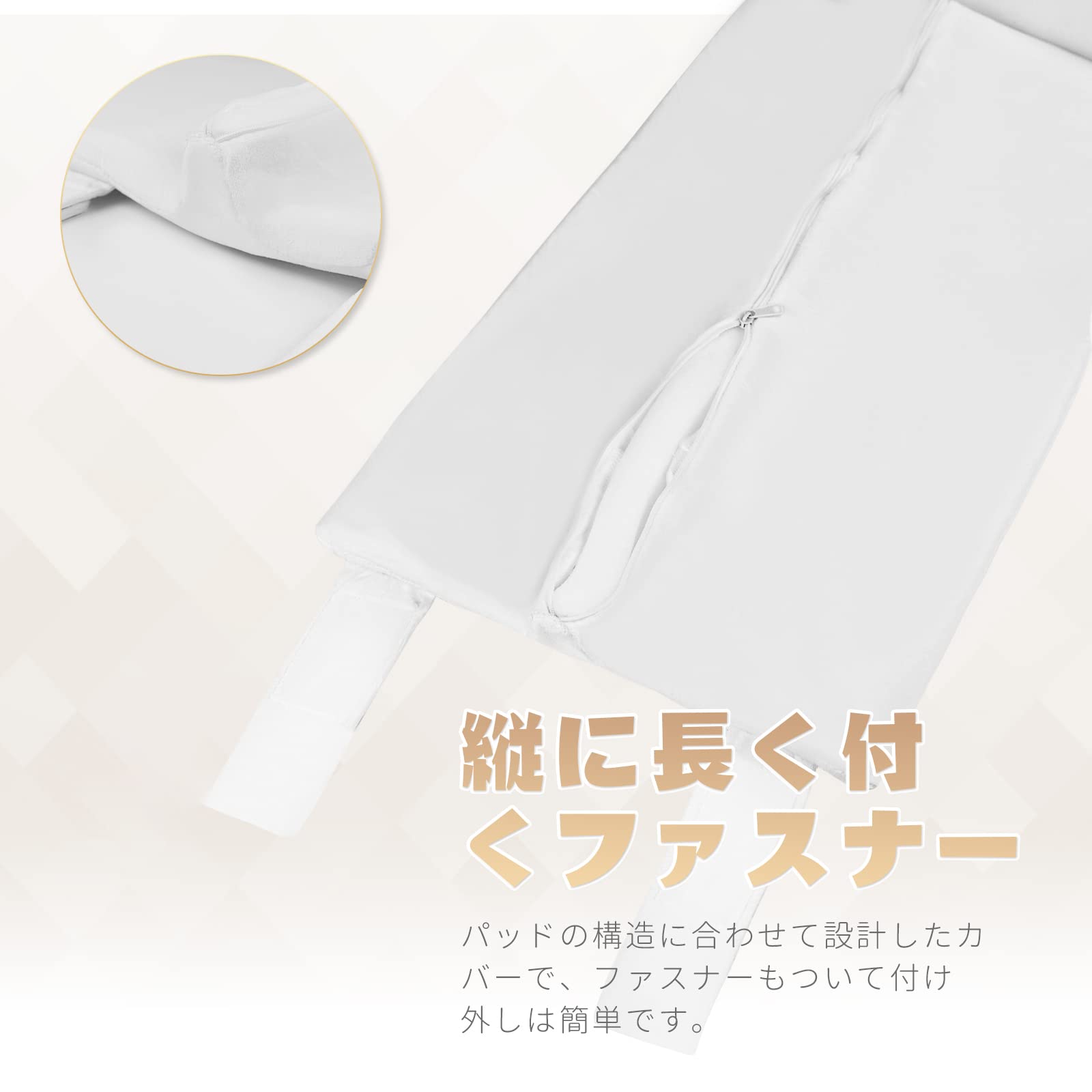【縦に長く付くファスナー】すきまパッドの構造に合わせて設計したカバーで、縦に長くつきでファスナーもついて付け外しは簡単です。