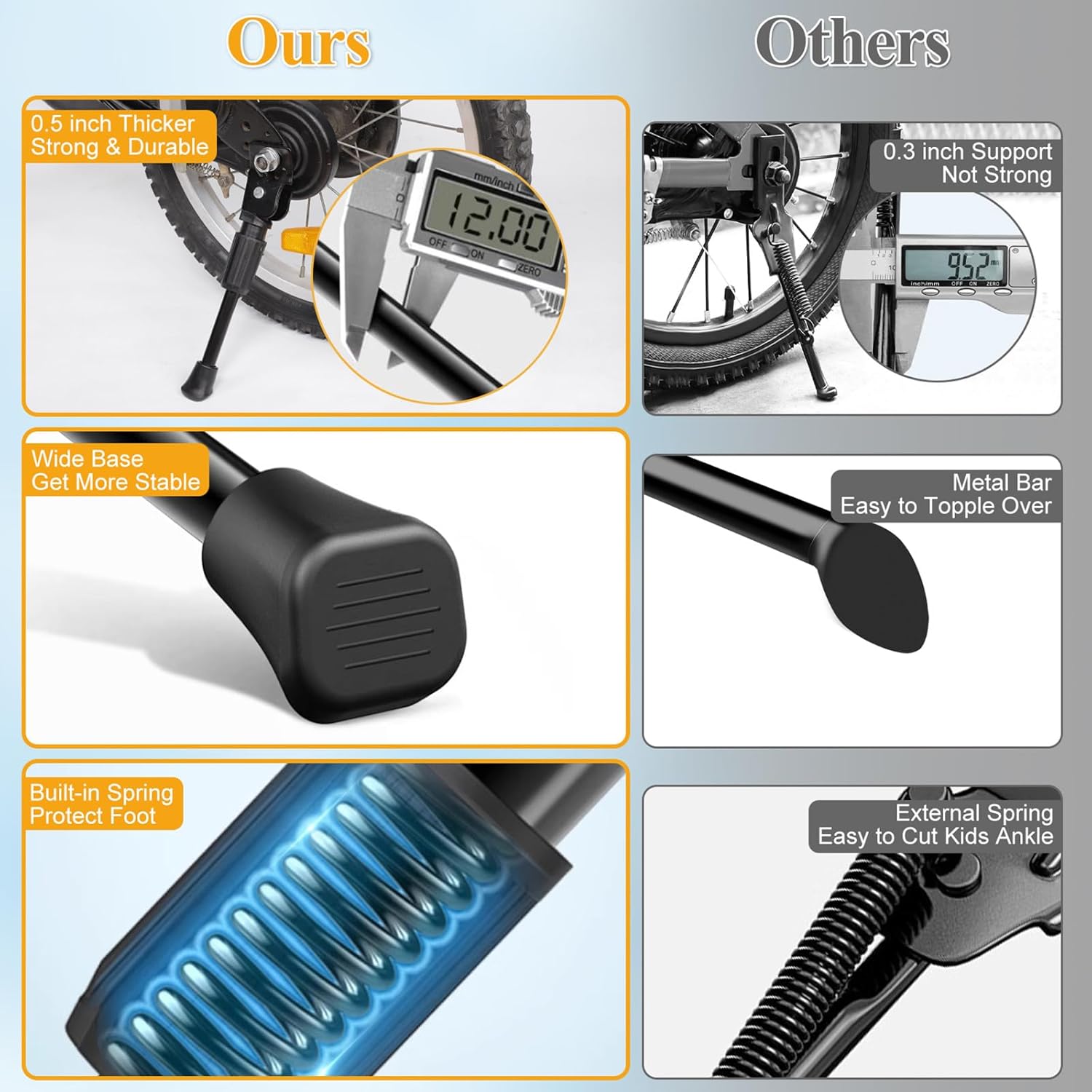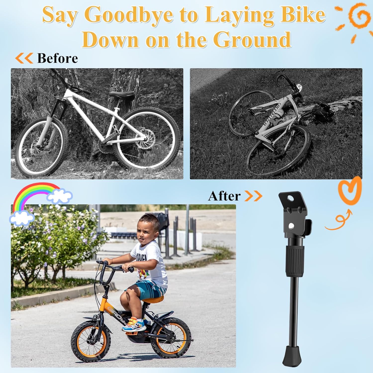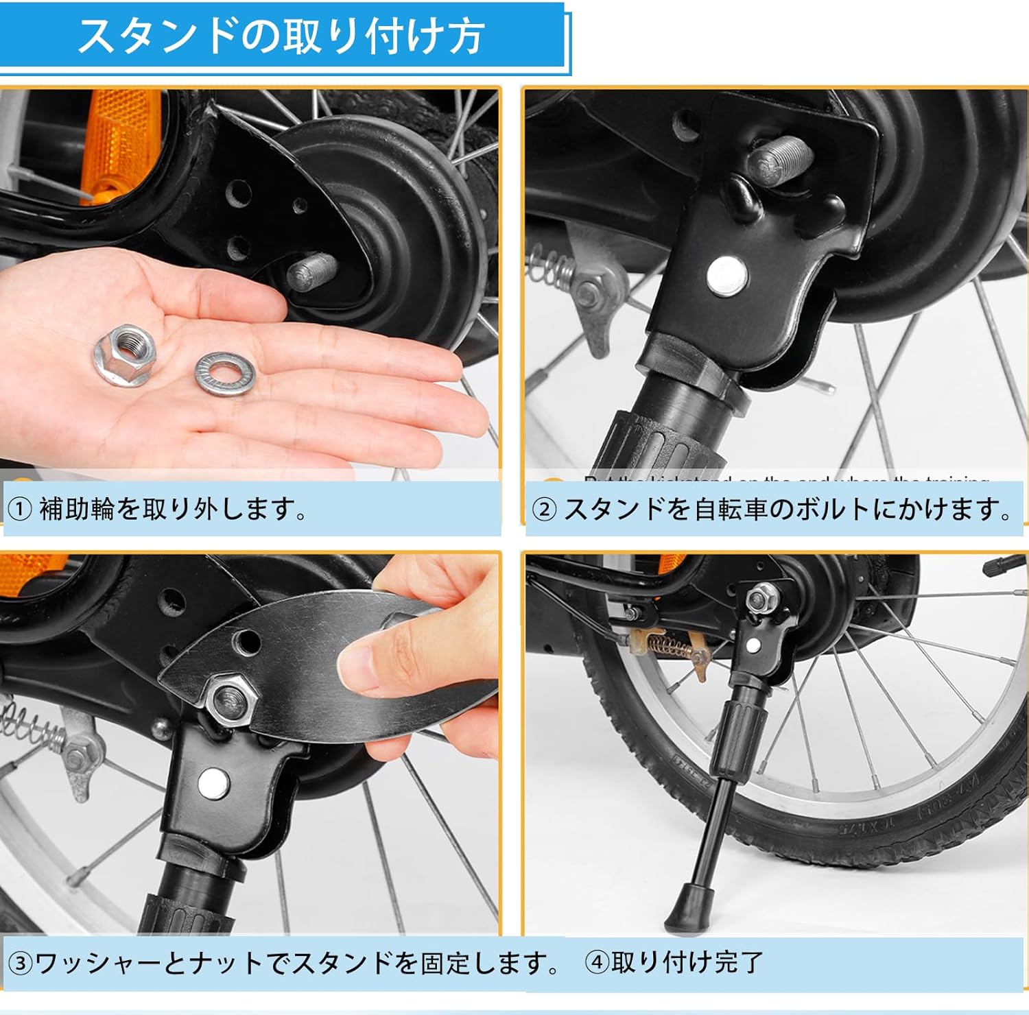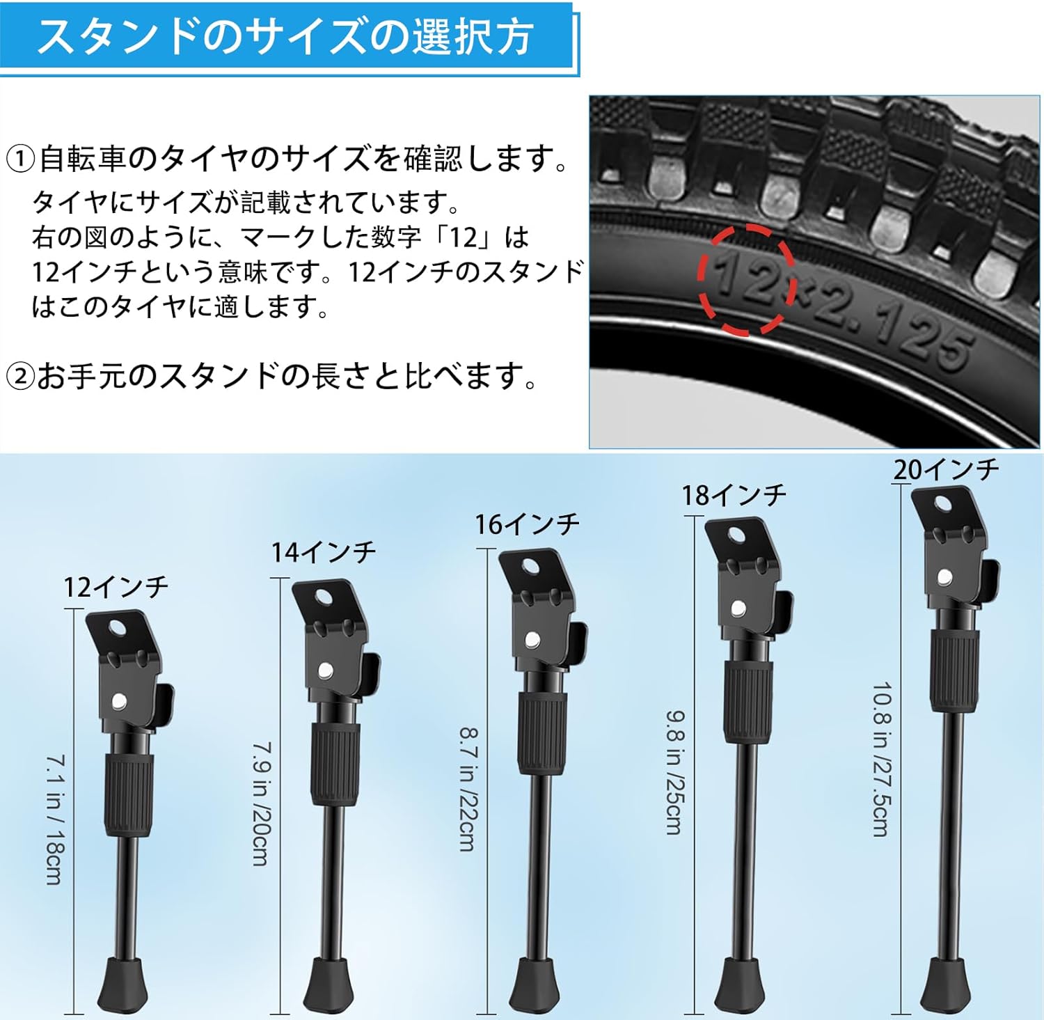タイヤサイズ12インチの自転車に対応可能、ご購入する前に、自転車のタイヤのサイズをご確認ください。確認方法は写真に記載されています。キックスタンド、ワッシャー、ナット、取扱説明書