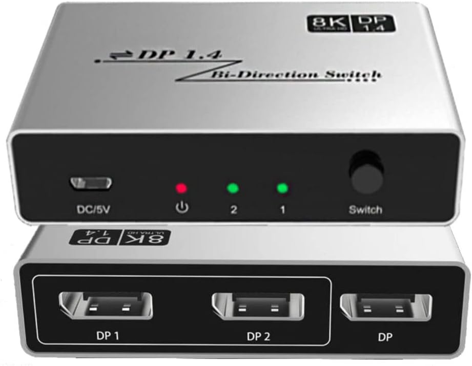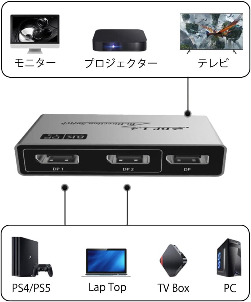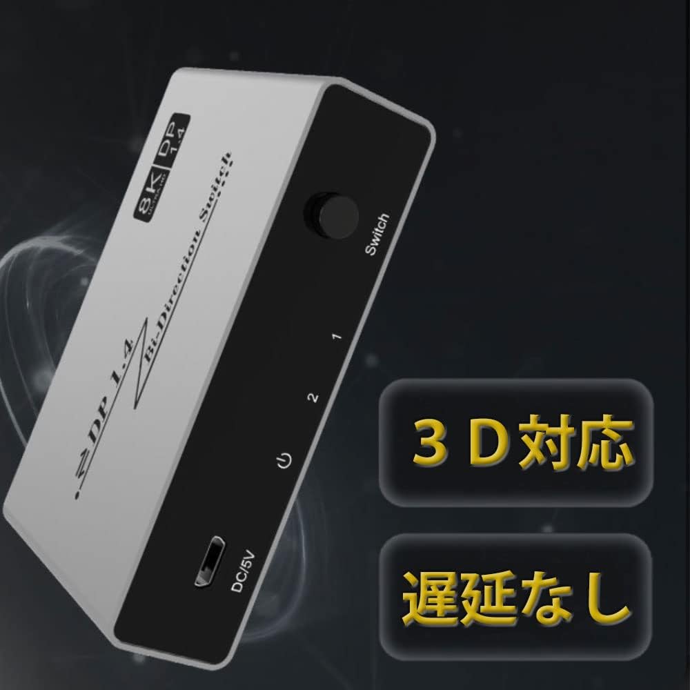 | 2つのDPソースを1つのDPディスプレイに接続したり、1つのDisplayPortソースを接続して2つのディスプレイの間に切り替えたりできます。(ご注意:2つのディスプレイを同時に表示することはできません)。DisplayPort 1.4規格8K @ 60Hzの解像度に対応し、3D HDR 4:4:4、4:2:2、4:2:0をサポートしています。DP1.2、DP1.1などと下位互換性があります。 |