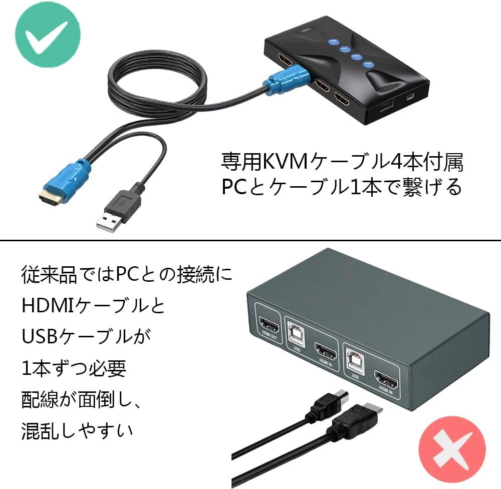 | PC側のUSB・HDMI端子からの給電で動作可能なため、別途電源アダプターは不要。さらに、ドライバーインストール不要のプラグ&プレイ設計で、接続すればすぐに使用できます。 USB2.0ポートを3口搭載しており、キーボード・マウスの他にプリンターやUSBメモリなども複数のPCで共有可能。KVM機能に加えて、USBハブとしても活用できる利便性の高いモデルです。 日本語取扱説明書が付属しており、初めての方でも導入がスムーズ。 |