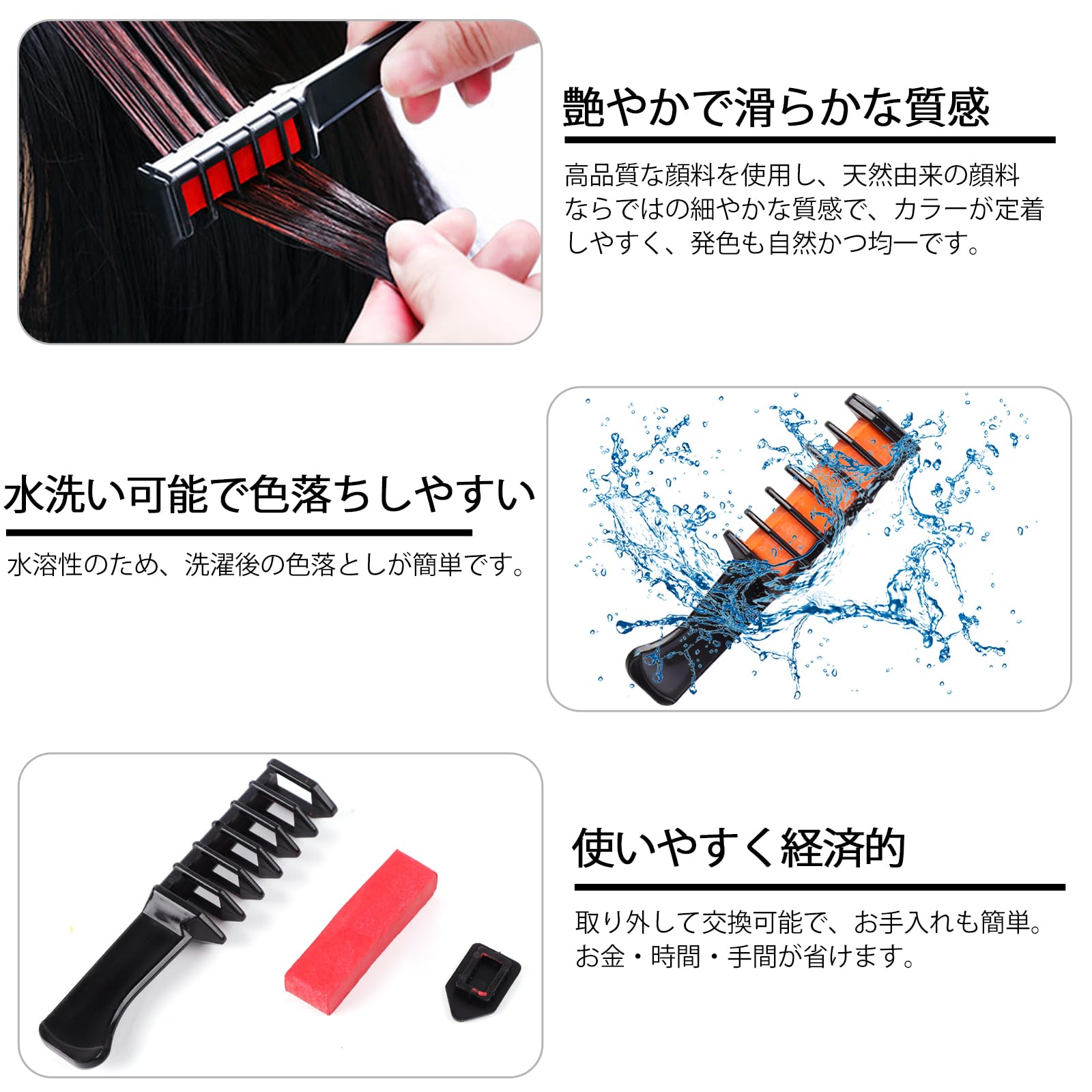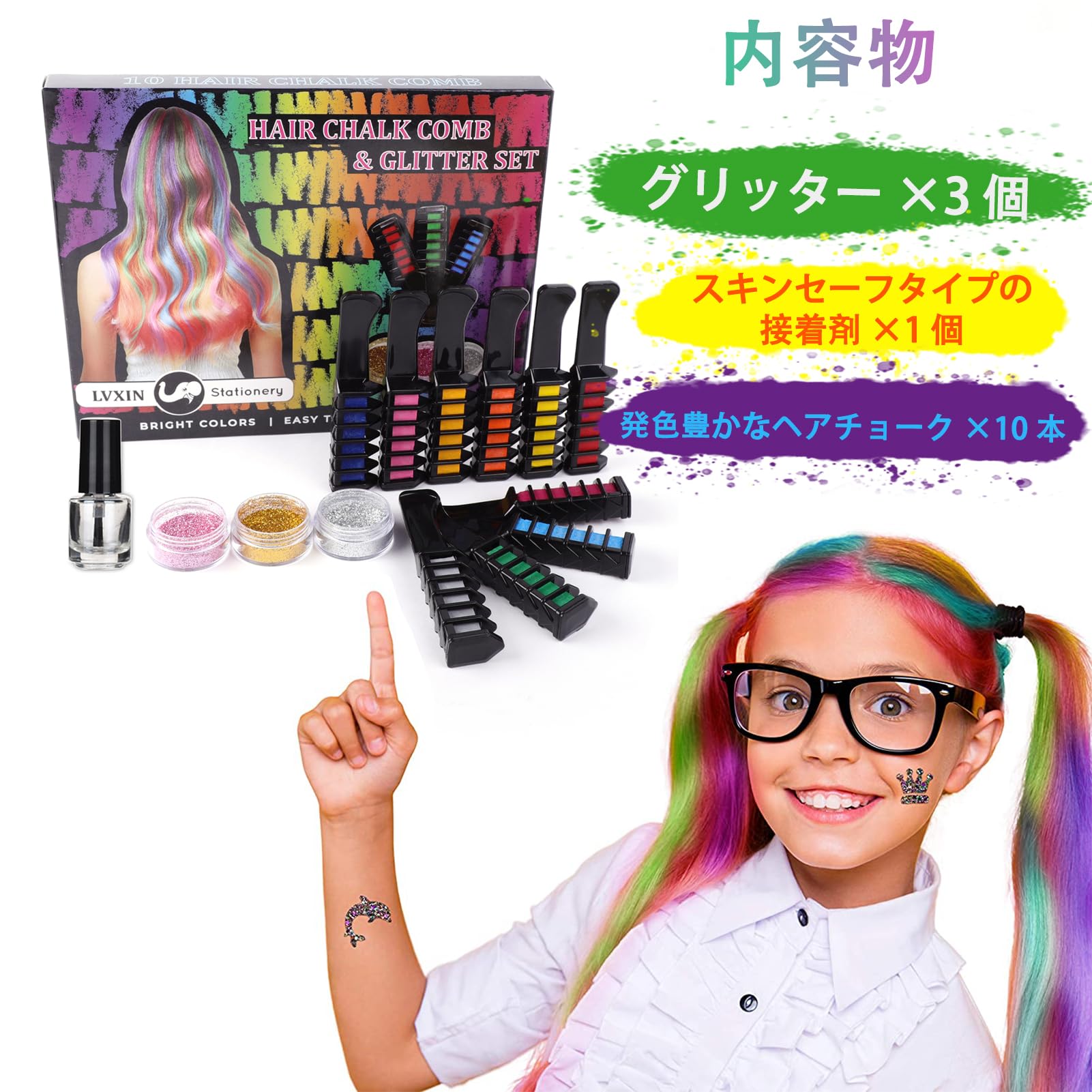 | 10個カラーヘアチョーク+3個キラキラパウダー。水で簡単に落とせます。ハロウインやクリスマス仮装パーティー、舞台演出、コスプレなど様々なイベント大活躍してくれ間違いなし!ヘアチョークは、水溶性で環境に優しいものであり、最大3日間連続的に使用できます。いつものように水とシャンプーで髪を洗って色をきれいにしてください。 |