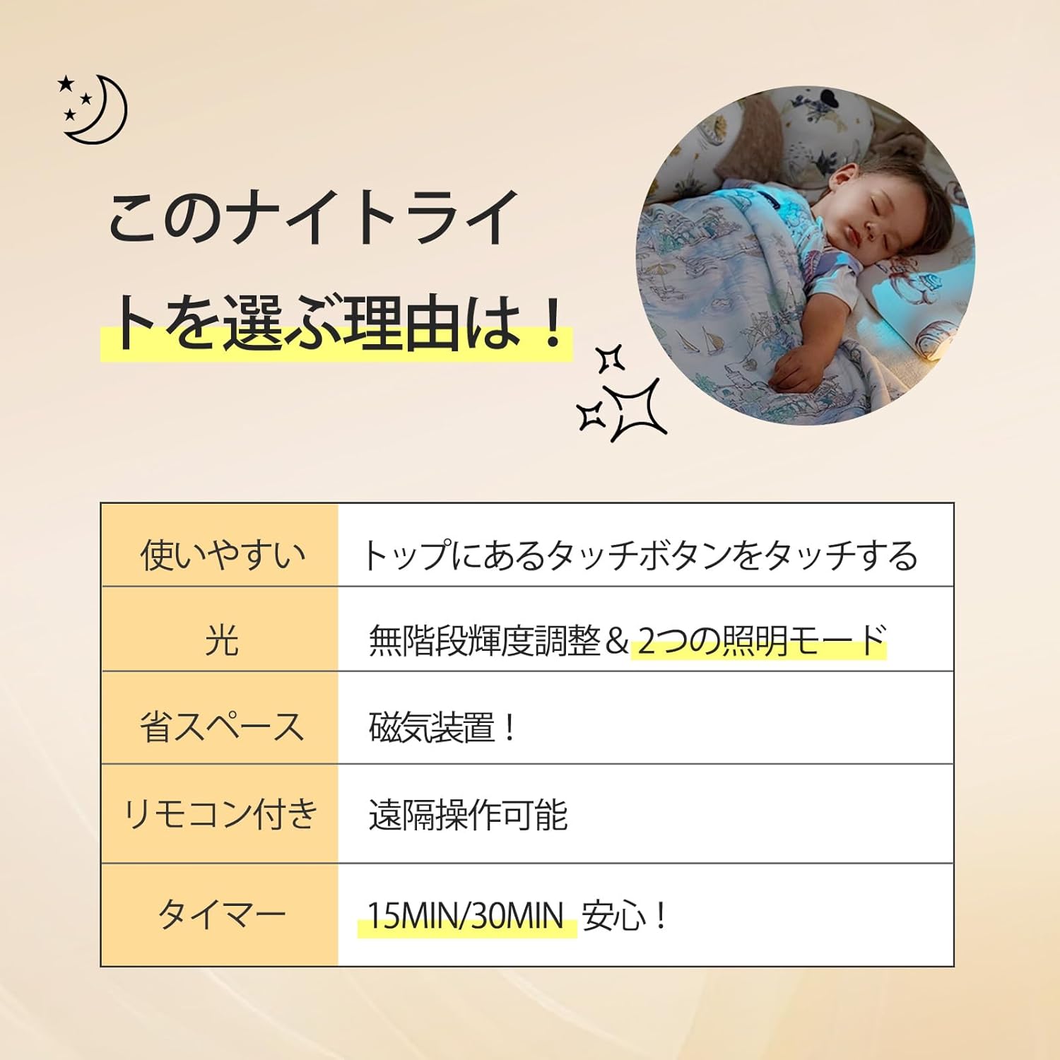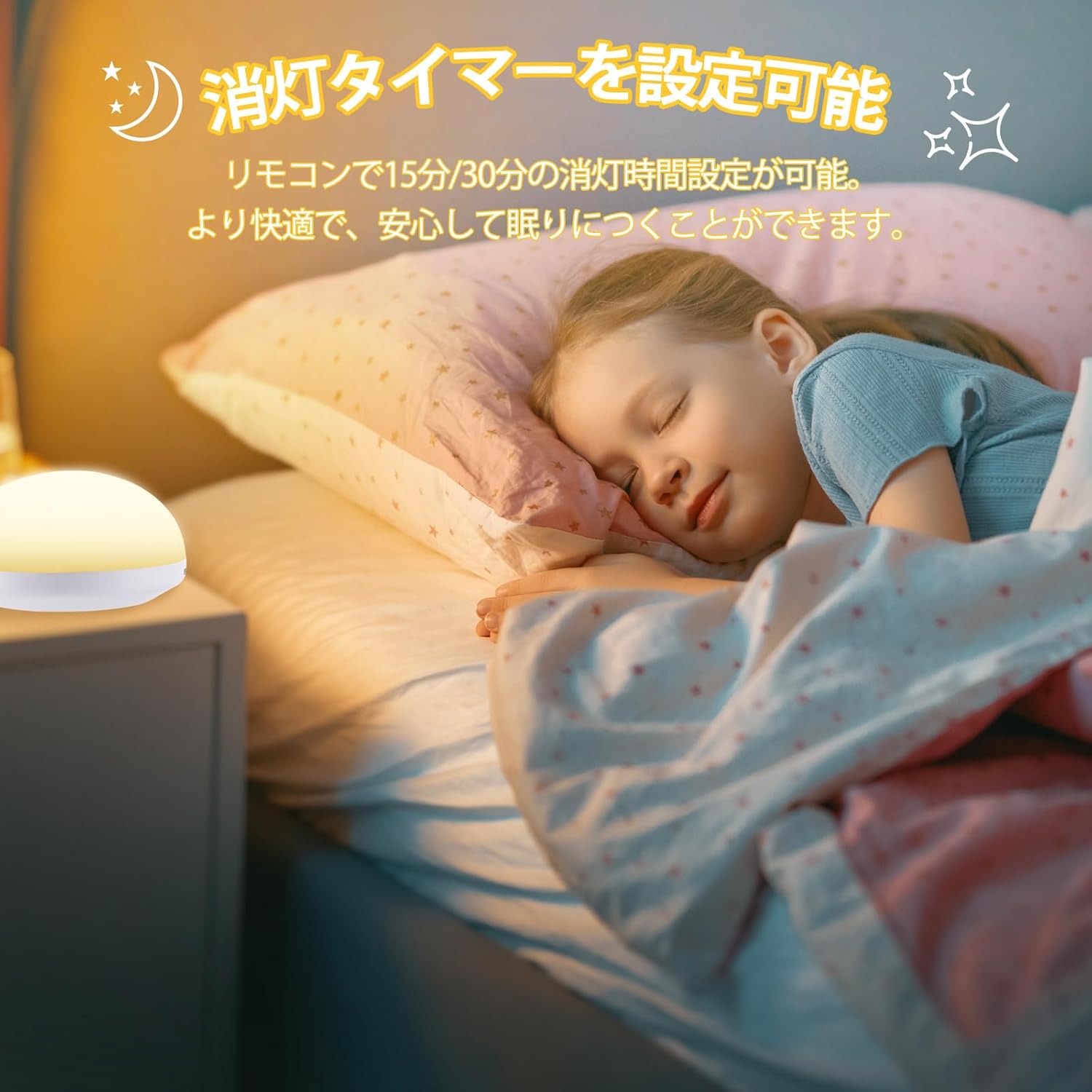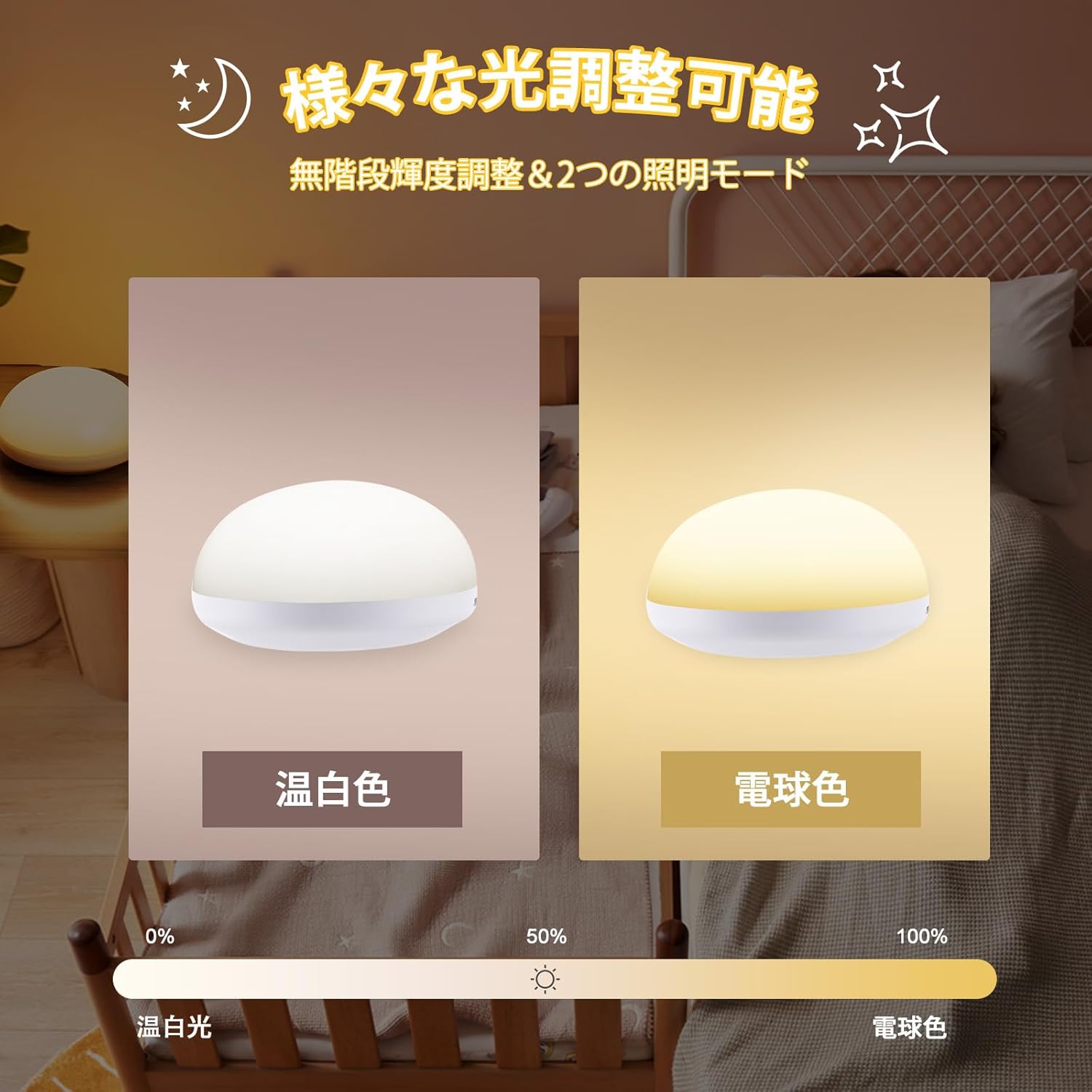 | 白色光と暖色光の2色の光が搭載されています。お客様の実際の状況に応じて色温度を調整し、最も快適な状態を実現します。読書、眠り、授乳のための快適でリラックスできる環境を実現します。 |