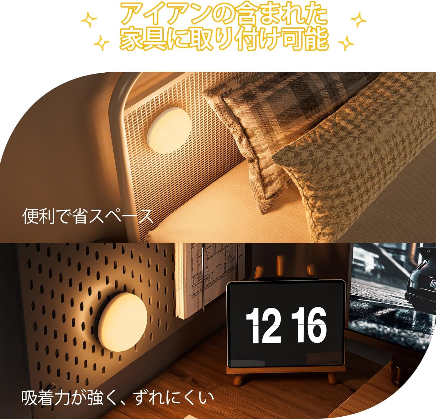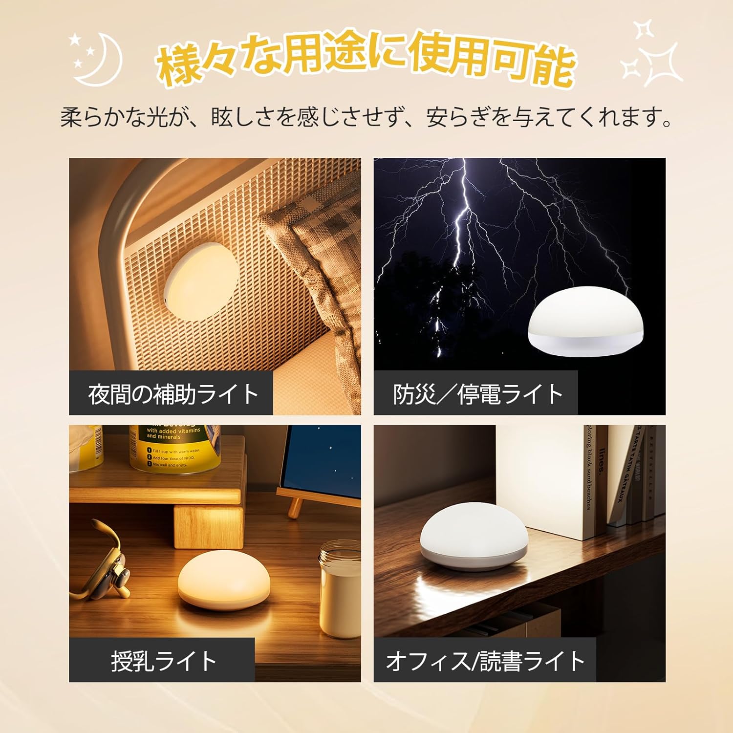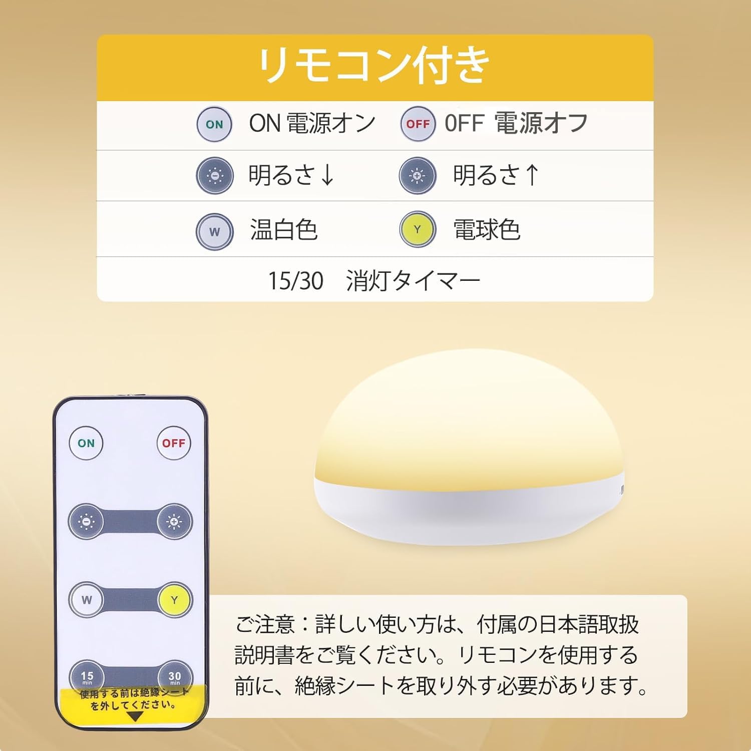 | タッチスイッチを長押しすることで、10%から100%の光源に調整できます。環境に適応した光を提供することができます。強すぎる光、弱すぎる光に悩まされることはありません。 リモコンは小型で精巧で、スペースを取りません。リモコンは手元で調整でき、とても便利です。 詳しい使い方は、付属の日本語取扱説明書をご覧ください。 照明器具のトップにあるタッチボタンをタッチするか、リモコンで光を調整できます。手のひらサイズの接触面ので、上部のスイッチに軽く触れるだけで点灯します。夜中に意識が朦朧とした状態でも、簡単にスイッチを入れることができます。 |