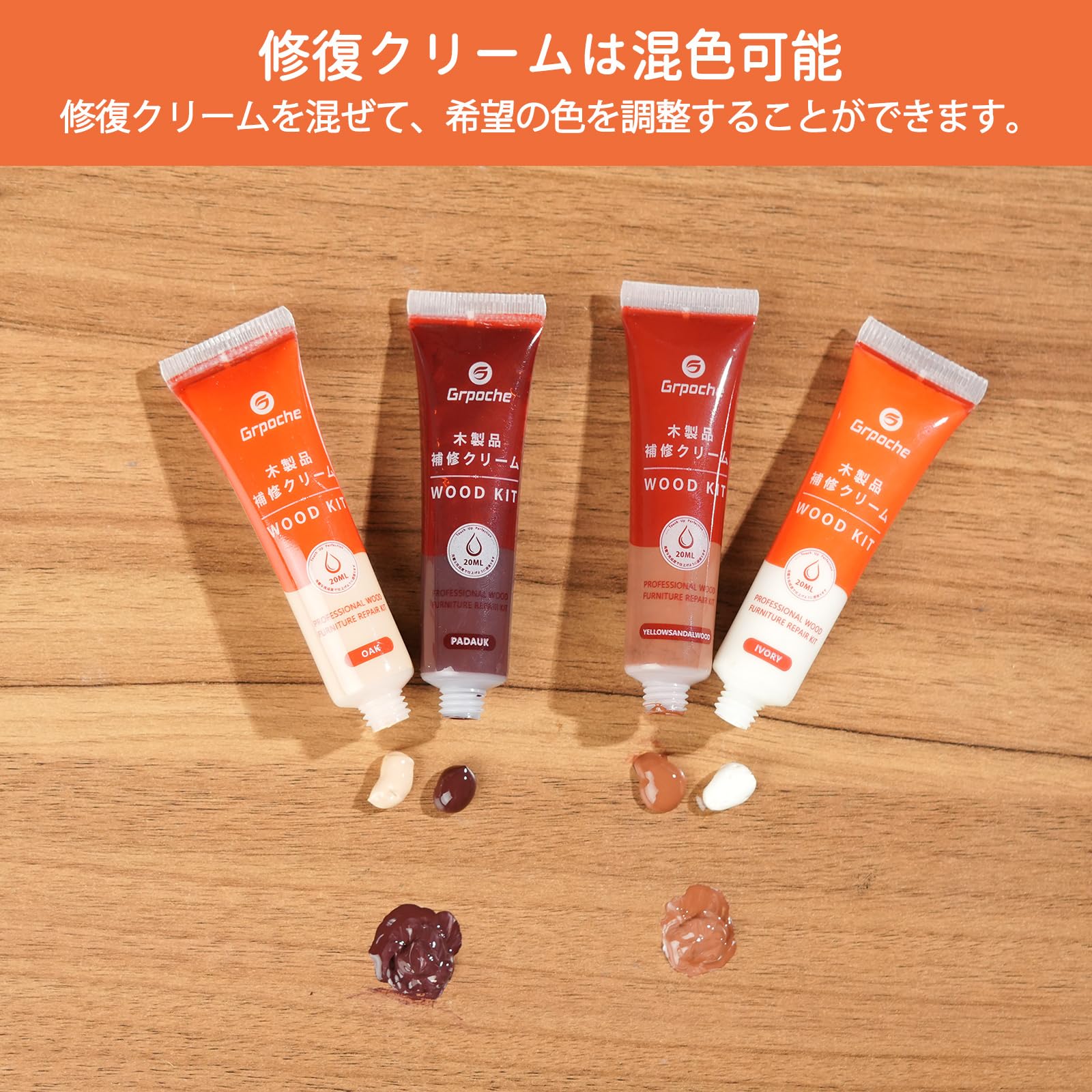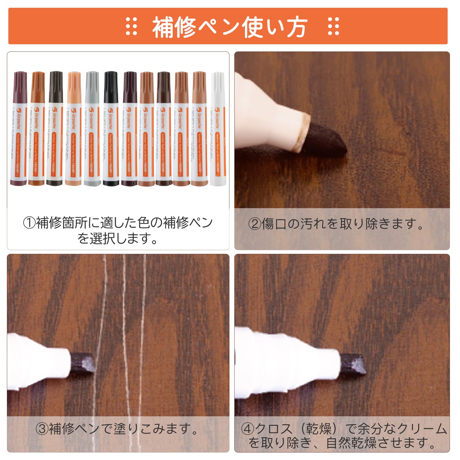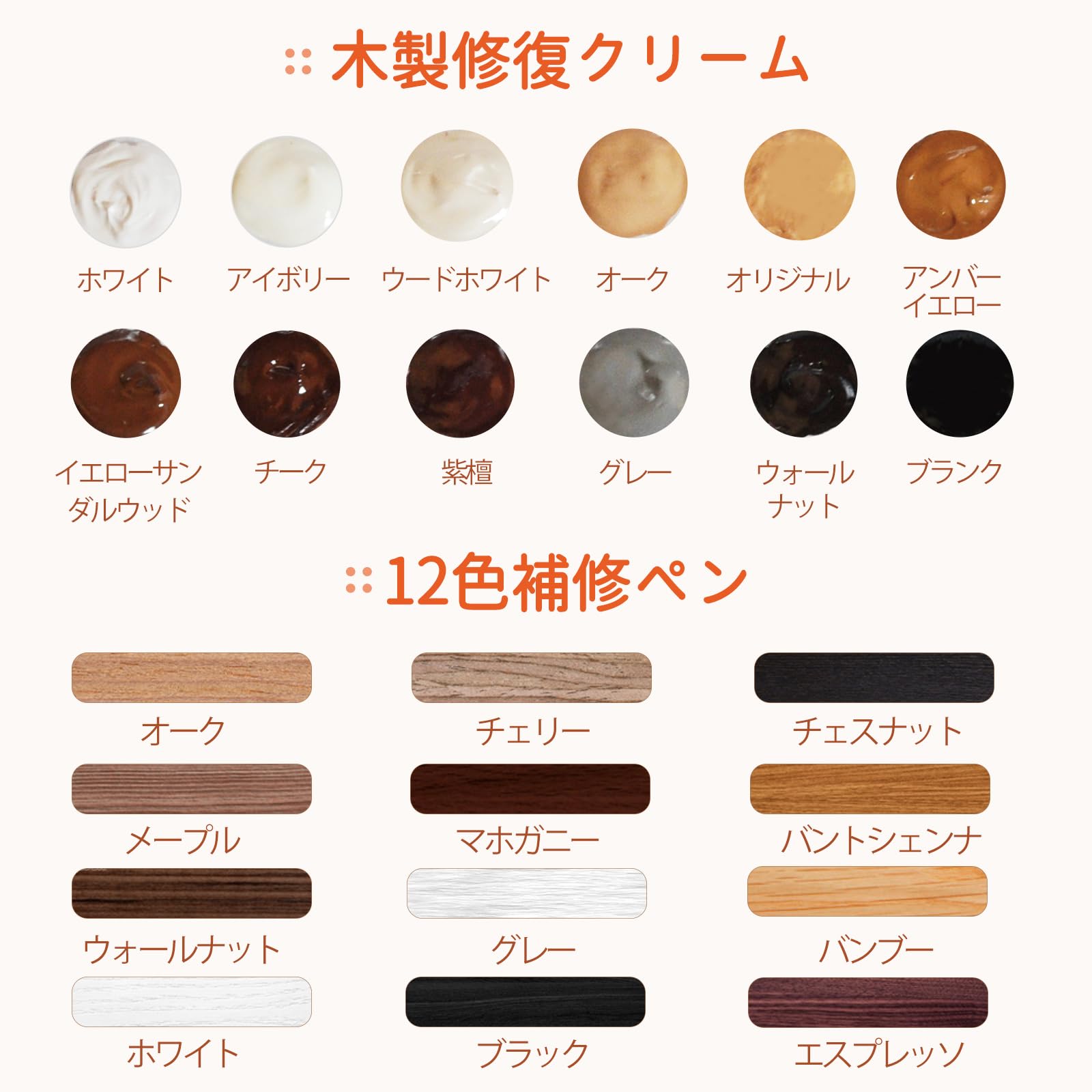 | 12色木製品補修クリーム:ホワイト、アイボリー、ウッドホワイト、オーク、ナチュラル、アンバーイエロー、イエローサンダルウッド、チーク、紫檀 、グレー、ブラックウォールナット、ブラック。12色補修マーカー:ブラック、グレー、ホワイト、マホガニー、メイプル、オーク、チェリー、ウォールナット、チェスナット、バーントセナ、バンブー、エスプレッソ。 |
