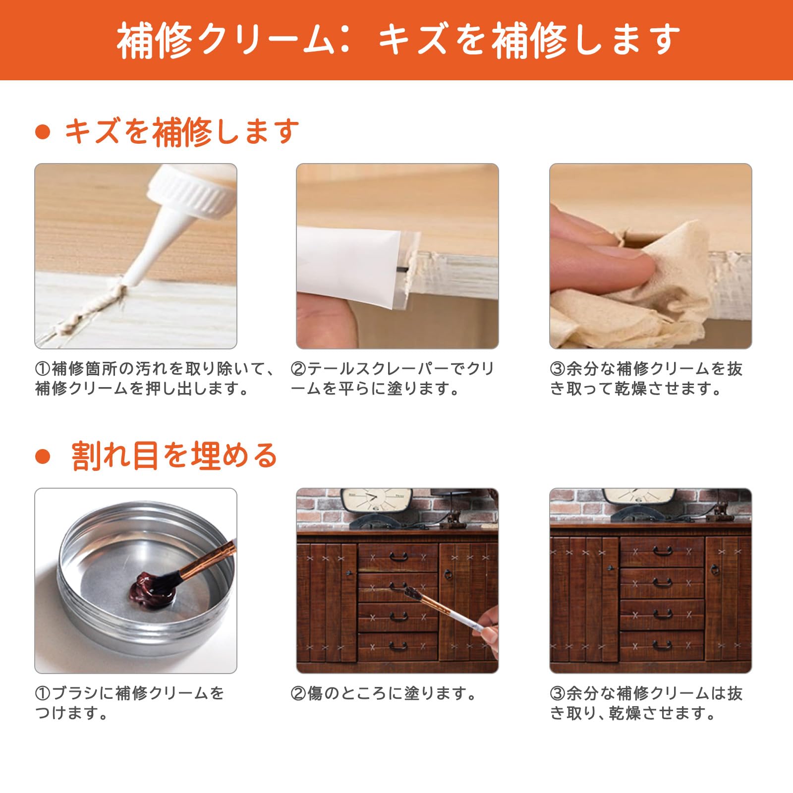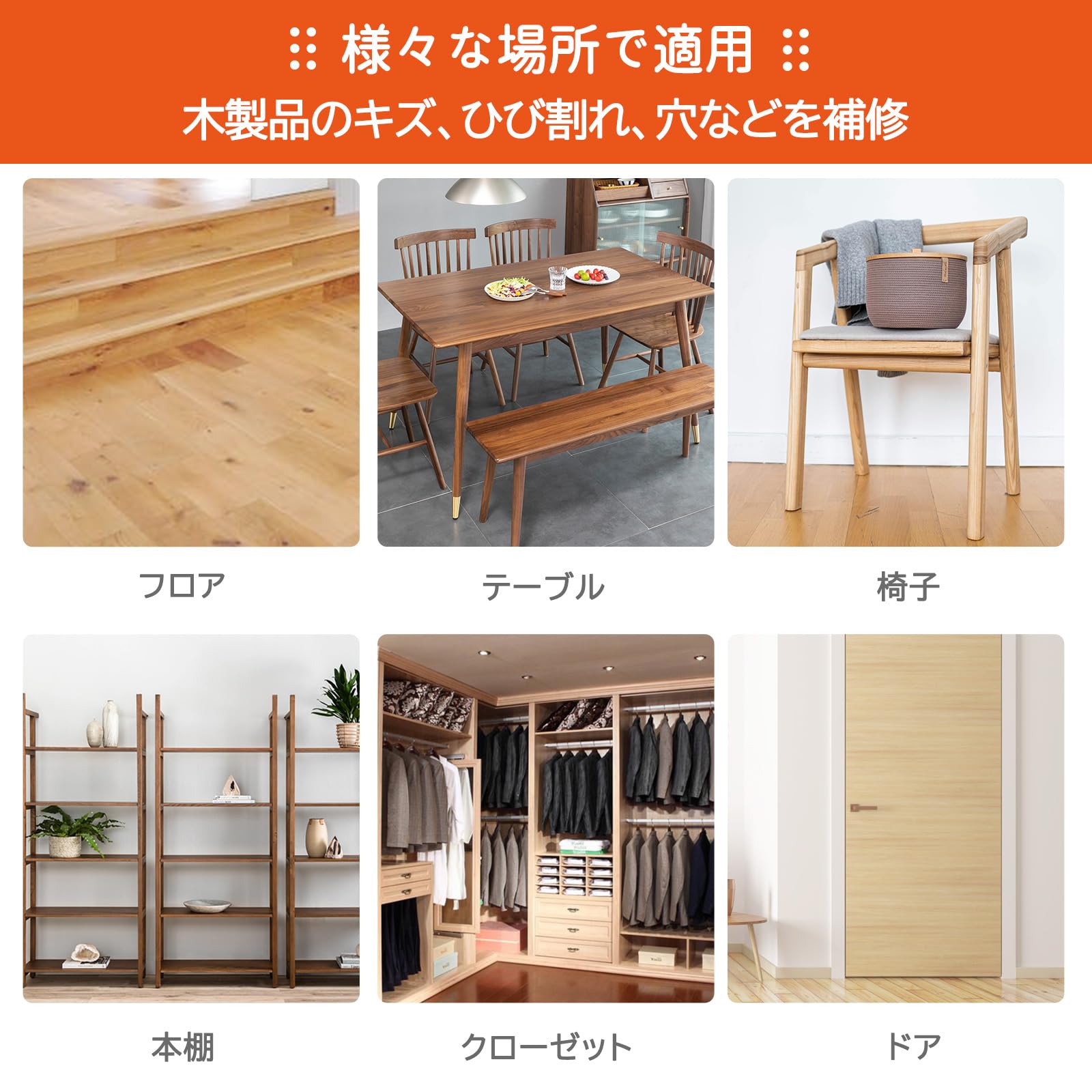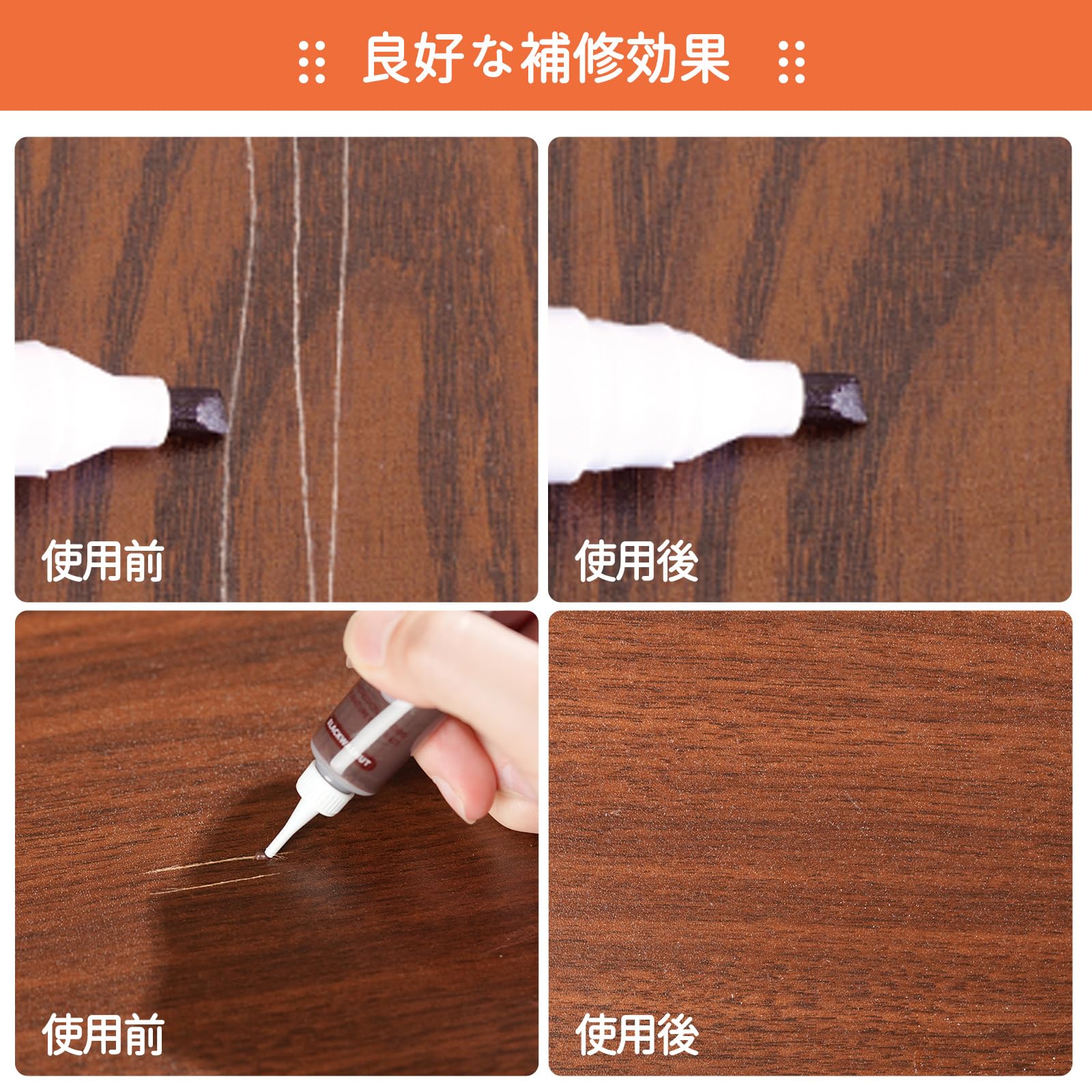 | 12色木製品補修クリーム:ホワイト、アイボリー、ウッドホワイト、オーク、ナチュラル、アンバーイエロー、イエローサンダルウッド、チーク、紫檀 、グレー、ブラックウォールナット、ブラック。12色補修マーカー:ブラック、グレー、ホワイト、マホガニー、メイプル、オーク、チェリー、ウォールナット、チェスナット、バーントセナ、バンブー、エスプレッソ。 |