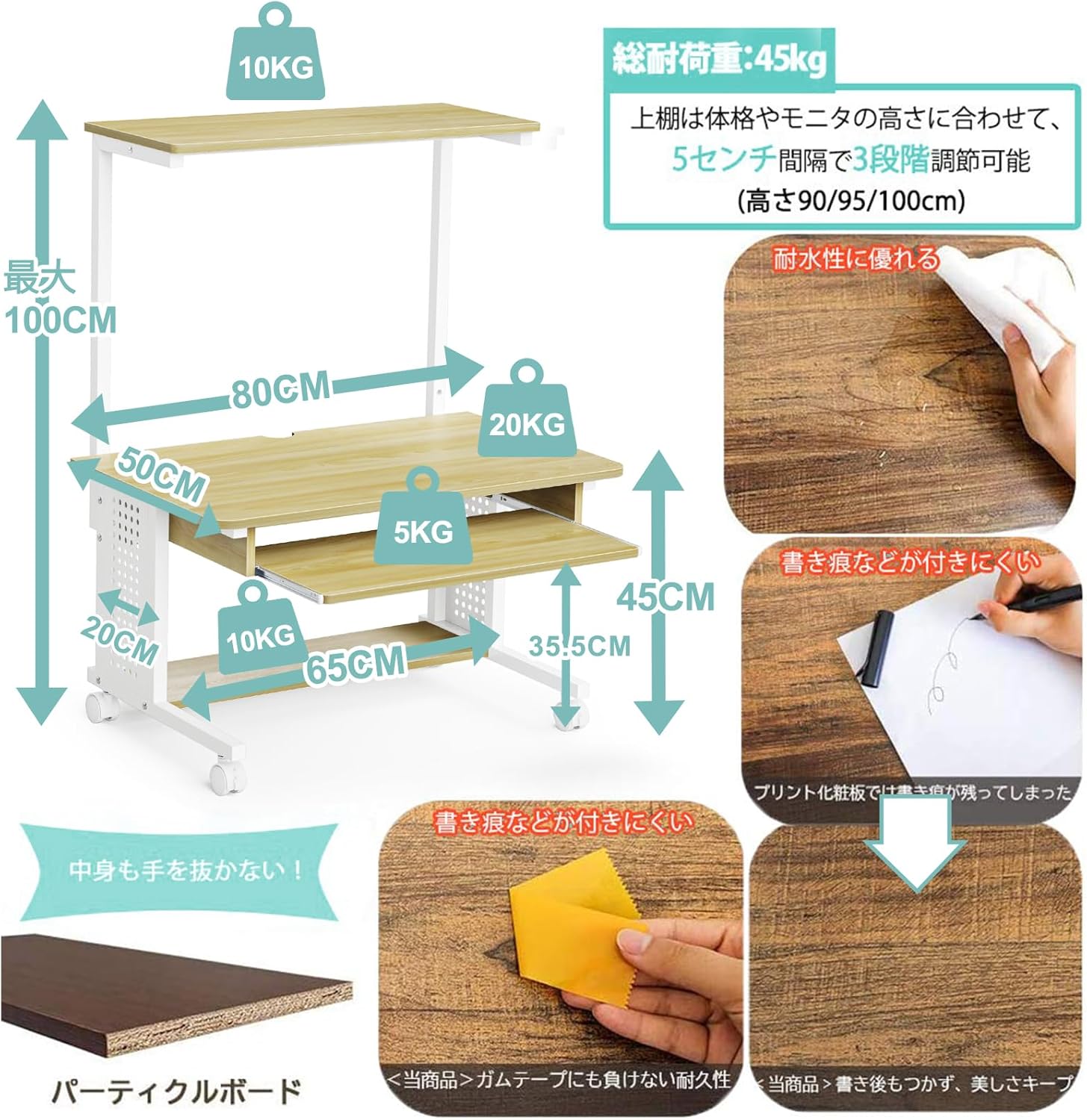 | このパソコンデスクは360°回転のキャスターが付いて、移動しやすくて部屋の掃除が便利です。 天板・棚板・:パーチクルボード 厚さ:15mmパーチクルボードは木材または他のリグノセルロース材料で作られました。メラミン化粧板を採用し、擦り傷防止で耐熱性や耐水性が優れています。 サイズ:80X50X90/95/100cm(天板の高さ:45cm) 総耐荷重:45kg 上棚:10kg 天板:20kg キーボード:5kg 下棚:10kg |